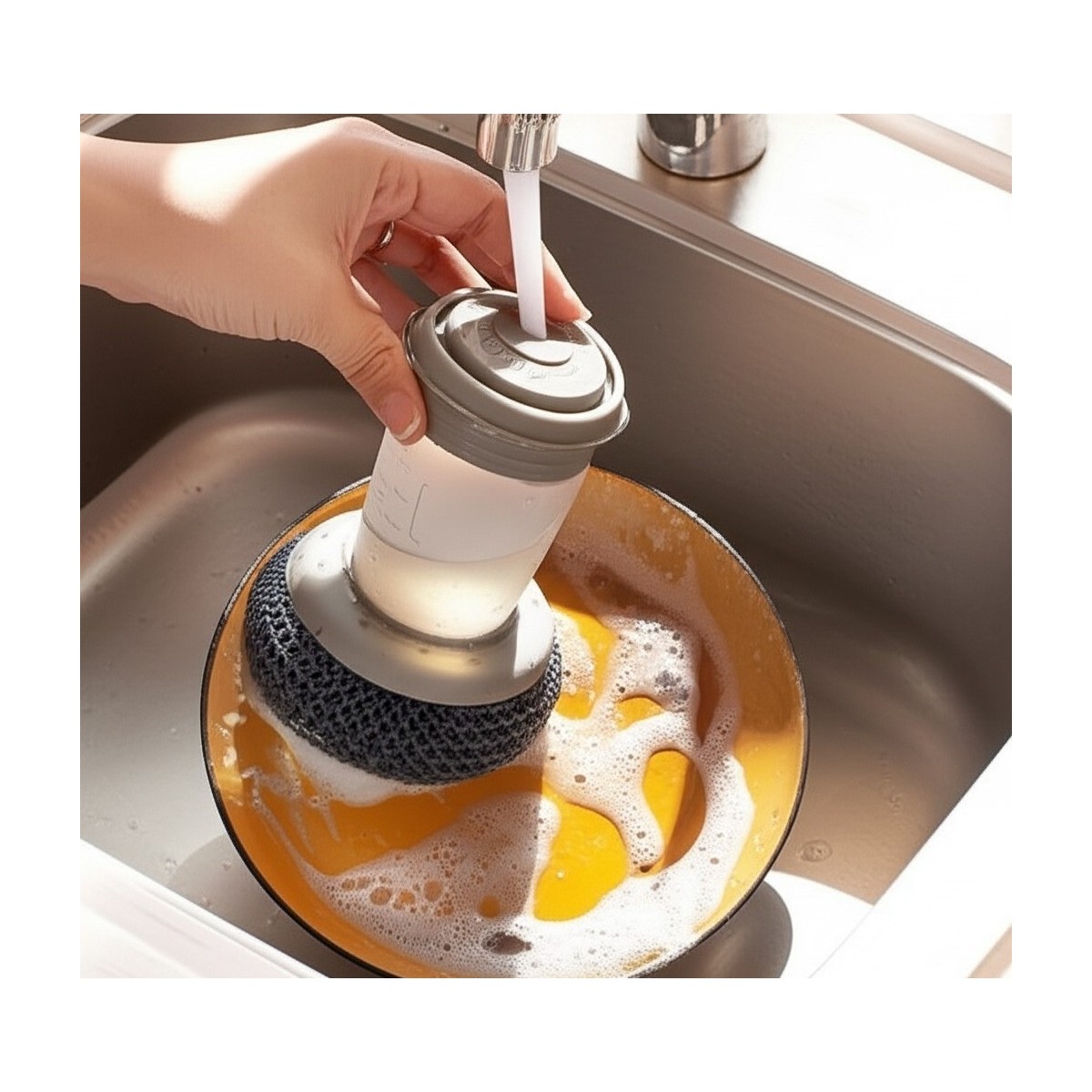 Runaway Deterjan Hazneli Telli Bulaşık Fırçası, inatçı yemek artıklarını kolayca çıkaran 2 adet tel sistemi ve deterjan pompası ile tasarlandı. İç haznesine doldurduğunuz sıvı deterjan, tek dokunuşla fırça telleri arasından köpürerek hijyenik temizlik sağlar.