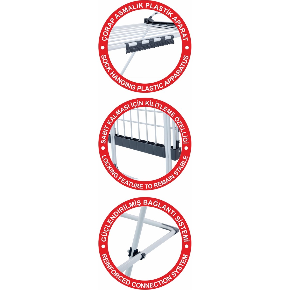 Fonksiyonel Detaylar; Dar mekânda çok çamaşır kurutabilme kolaylığı ; 22 m çamaşır kurutma kapasitesi ; Nano teknolojisi uygulamasıyla boya öncesi özel spreyleme temizleme. ; Tamamı elektrostatik fırınlanmış toz boya özelliği ile ısıya, dış koşullara dayanıklıdır ve nemli havada bozulmaz. ; Çorap asmak için özel tasarlanmış plastik aparat. ;