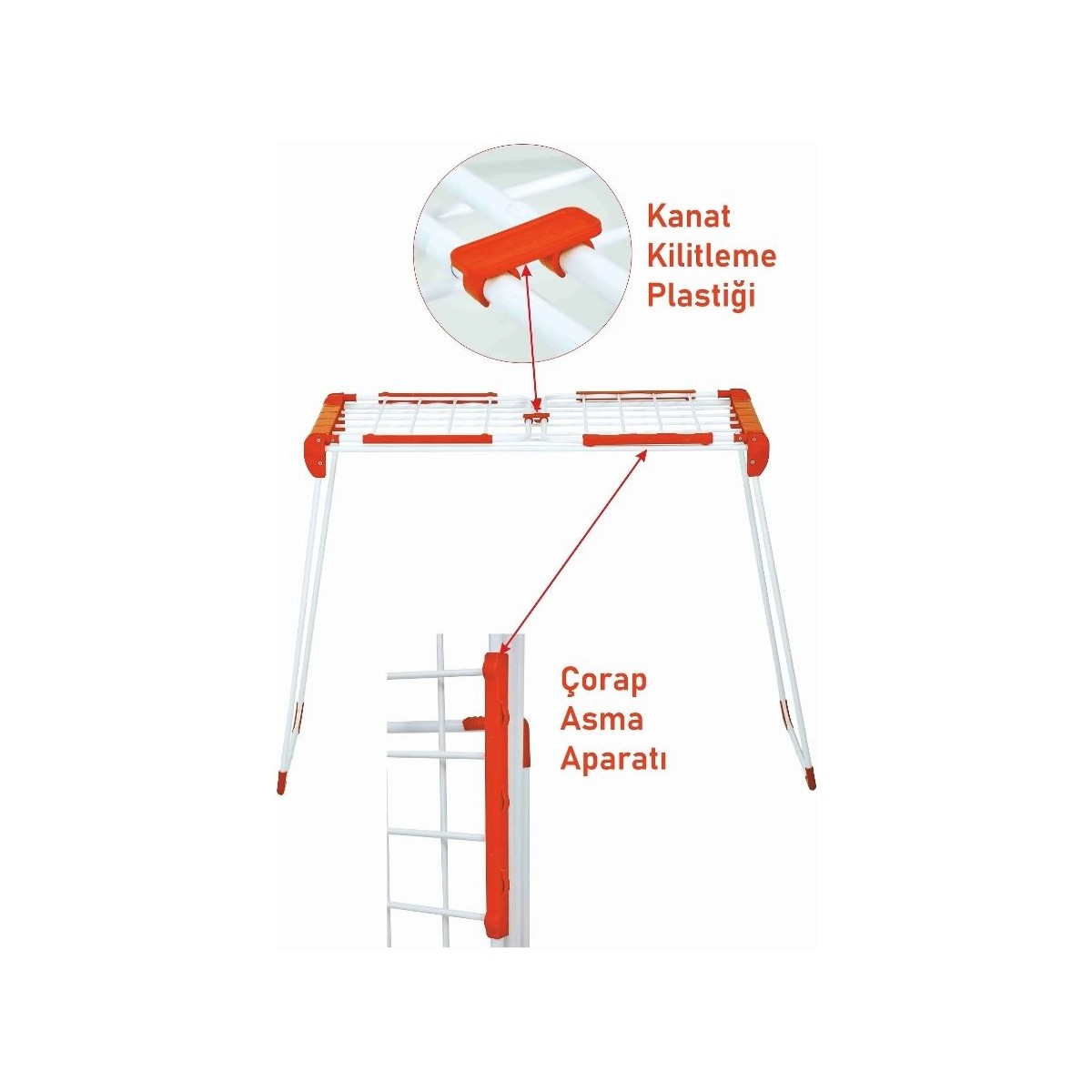 Fonksiyonel Detaylar ; Dar mekânda çok çamaşır kurutabilme kolaylığı ; 20 m çamaşır kurutma kapasitesi ; Nano teknolojisi uygulamasıyla boya öncesi özel spreyleme temizleme. ; Tamamı elektrostatik fırınlanmış toz boya özelliği ile ısıya, dış koşullara dayanıklıdır ve nemli havada bozulmaz. ; Çorap asmak için özel tasarlanmış plastik aparat. ;