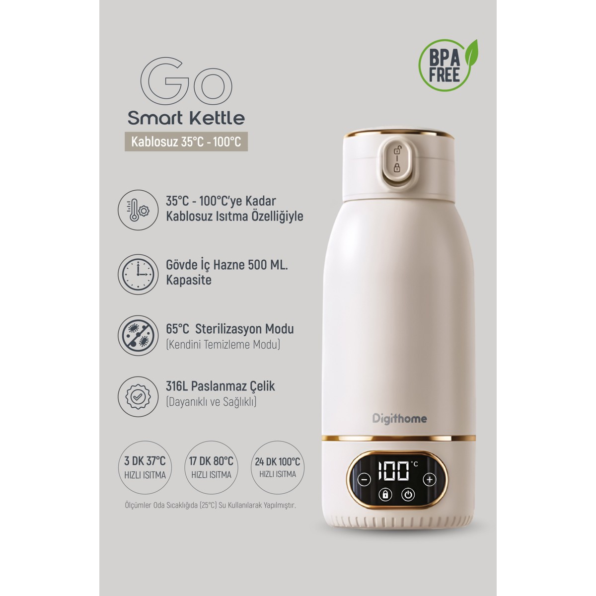 Digithome Go Smart Taşınabilir Şarjlı Çelik Su Isıtıcı Kablosuz Kettle (35-100 C°) Milky Whıte 500 Ml Dgt-102