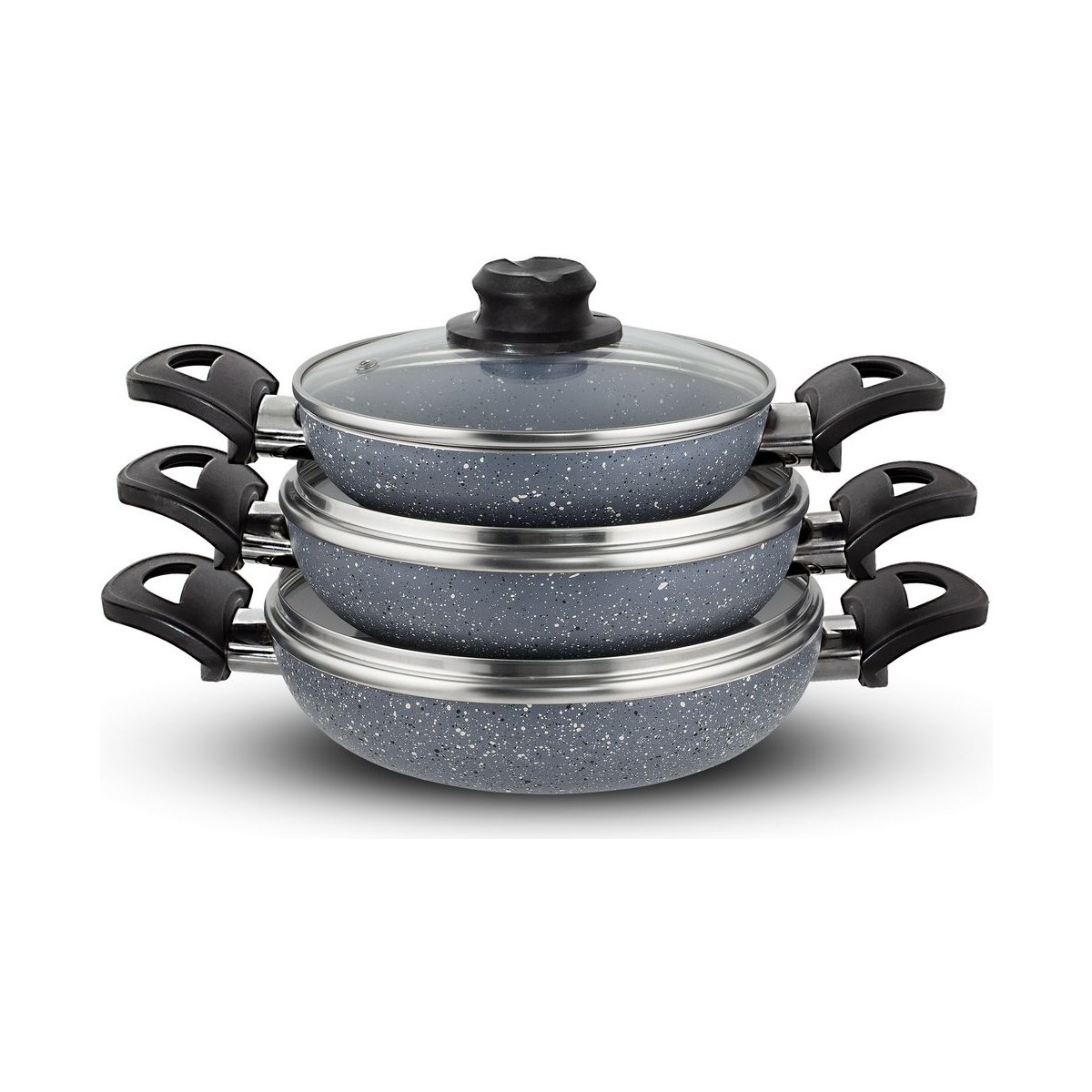 • 18 cm 20 cm ve 22 cm Granit Efektli 6 Parça Cam Kapaklı Omlet/Sahan Tava Setimiz;