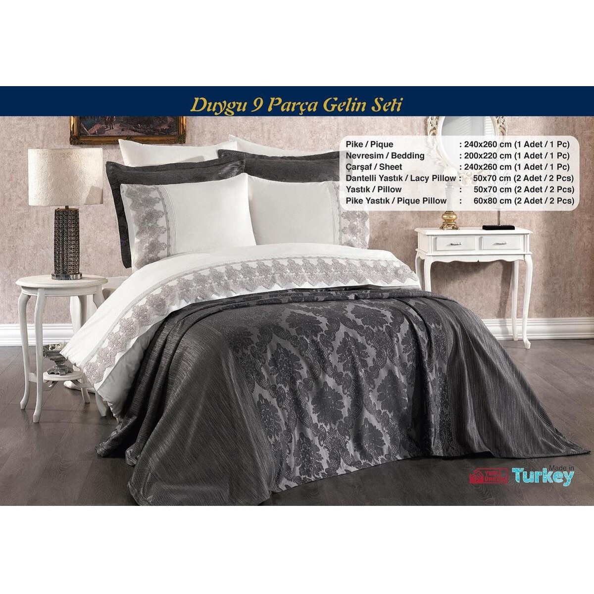 Krem Rengi, Gri Rengi, Antrasit Rengi, Gül Kurusu Rengi ve Cappucino Renkleri Mevcuttur. Lütfen Satın alırken ürün isminde yazan renklere dikkat ederek sipariş veriniz. Pike / Bed Cover: 240x260cm (1 adet / 1 piece) Nevresim / Duvet Cover: 200x220cm (1 adet / 1 piece) Çarşaf / Sheet: 240x260cm (1 adet / 1 piece) Dantelli Yastık / Lacy Pillow: 50×70 cm (2 adet / 2 pieces) Yastık / Pillow: 60×80 (2 adet / 2 pieces) Pike Yastık / Pique Pillow : 60×80 (2 adet / 2 pieces)