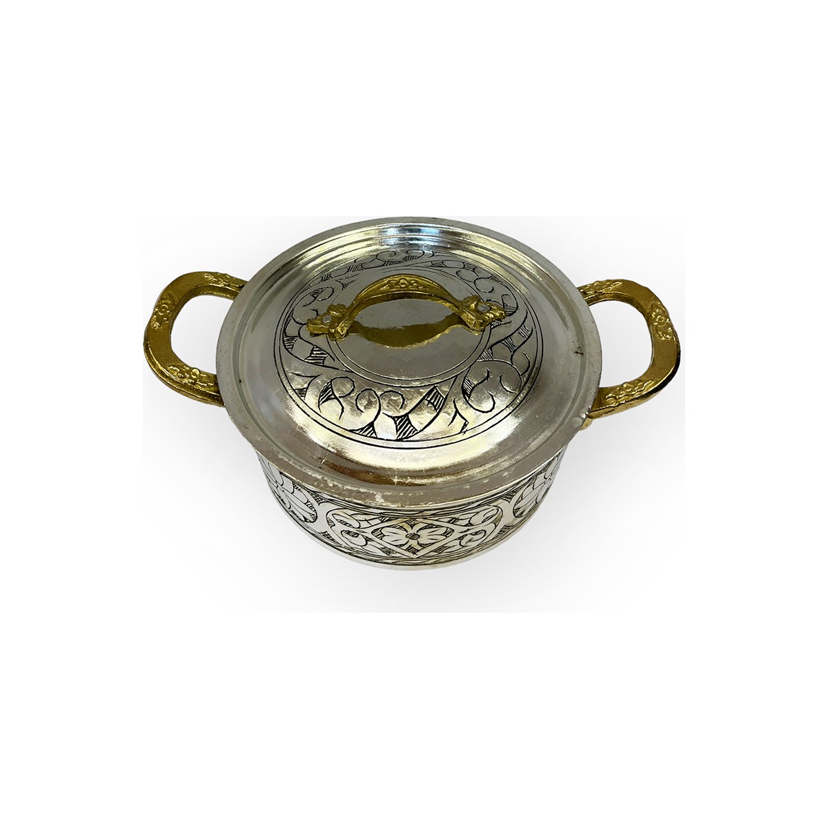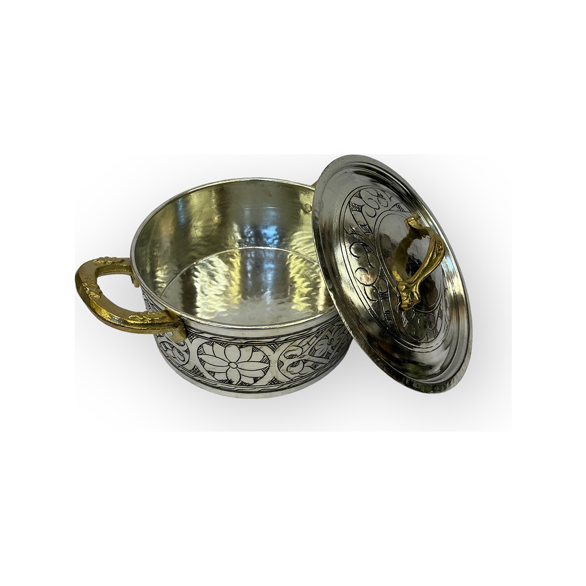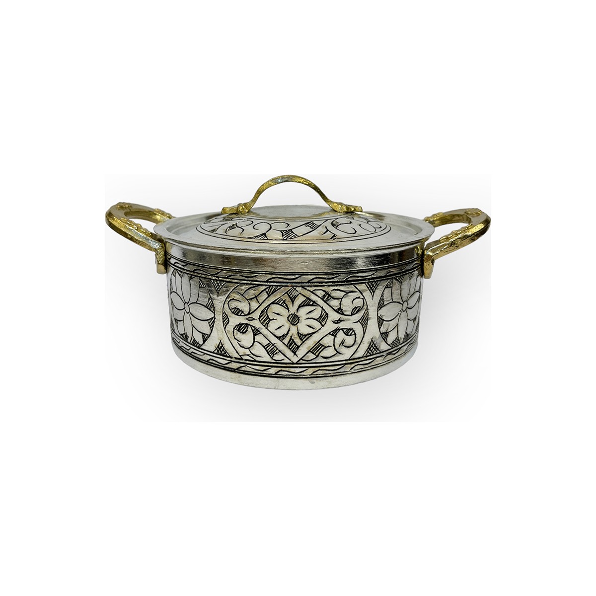 Ürünümüz bakırdan imal edilmiştir. İçi kalay dışı skoçlanarak eskitme görünüm verilmiştir. Üzerindeki motifler elde oyma işleme yapılarak nakşedilmiştir. Günlük kullanıma uygundur.