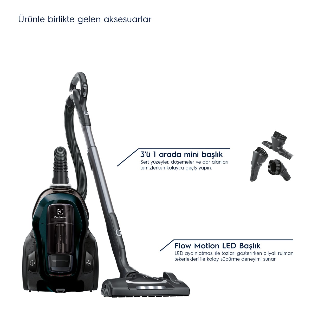 Kablo uzunluğu 3+1 evde tek noktadan her odaya erişebilecek kadar uzun. Makine tüy kadar hafif denebilir, hortum dipten de 360 dönüyor hareket ettirmesi kolay. İçindeki filtreler harika, büyük parke+halı başlığı harika max güçte halıyı bırakmıyor. 3ü1 arada başlık ve hortumu takmak için kola takılan aparat işlevsel. 3ü1 arada başlığı kilim ve dar yerleri süpürmek için açarak kullanıyorum, gayet iyi. Malzeme kalitesi çok iyi. Kesinlikle alınır.