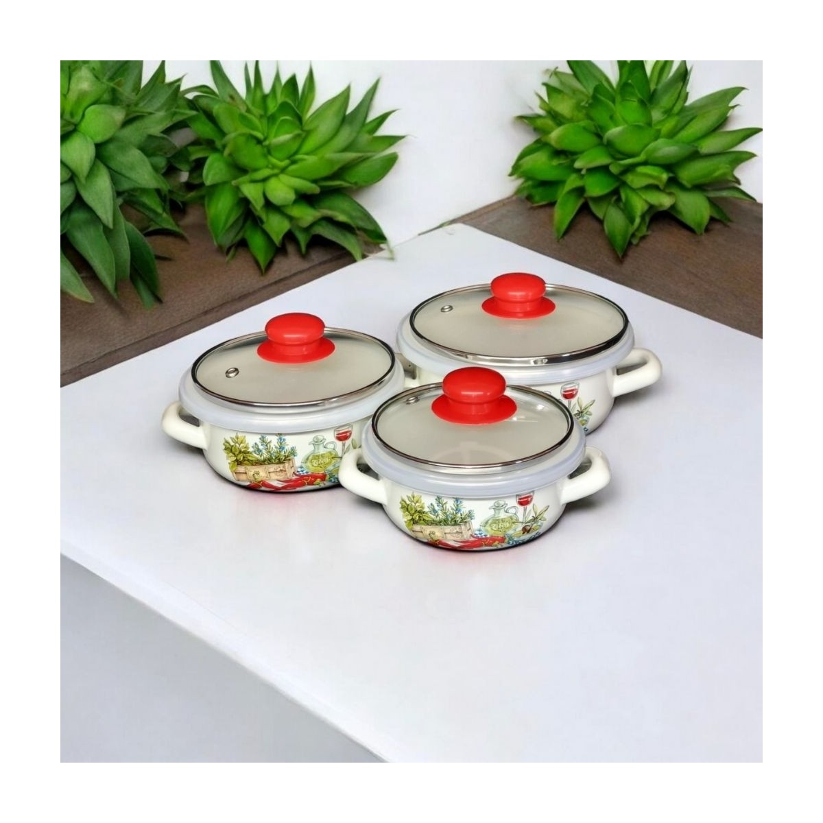 Pişir Sakla Tencere Seti 9 Parça Ürün İçeriği: 12 cm Tencere + Cam Kapak + Plastik Kapak 14 cm Tencere + Cam Kapak + Plastik Kapak 16 cm Tencere + Cam Kapak + Plastik Kapak Emaye Pişir Sakla Tencere Seti yemeklerinize lezzet katarken sunumlarınıza şıklık katacak. Temizleme işlemi yaparken sert malzemeler kullanılmaması gerekmektedir. Bulaşık Makinesinde Yıkanabilir. Emaye Tencereler ile pişirdiğiniz ürünleri silikon kapağı ile buzdolabınızda saklayabilir dilediğiniz zaman çıkarıp tekrar ısıtabilirsiniz. Emaye tencereler ile hem ocağınızda hem de odun veya kömür ateşinde ürünlerinizi pişirebilirsiniz. Bulaşık makinesinde yıkanır, camsı yapısı sayesinde pratik ve kolay temizlenir. Bütün ısı kaynaklarında kullanılabilir. Elektrikli, gazlı, camlı, seramik kaplamalı, endüksiyonlu vb. tüm ocak tiplerinde kullanıma uygundur. Yapay hiçbir element kullanılmaması ise emayelerin % 100 geri dönüştürülebilir olmasını sağlar. Bu sayede çevre dostu bir malzeme satın almış olursunuz. Emaye kaplamalar anti-bakteriyeldir ve kanserojen madde içermez. Camsı yapısı bakterilerin ürüne yapışmasına engel olur. Doğal hammaddelerin yüksek derecede pişirilmesi sonucu bileşenler arası boşluk azalır ve bakterilerin ürünün içine nüfus etmesi engellenir.ÇİNKO WİNTAGE……. DESENLİ EMAYE 3’LÜ PİŞİR SAKLA TENCERE SETİ ÜRÜN İÇERİĞİ: 3 ADET (12-14-16 CM) DESENLİ EMAYE TENCERE 3 ADET CAM TENCERE KAPAĞI 3 ADET SİLİKON KAPAK TOPLAM 9 PARÇADAN OLUŞAN SET ÜRÜN EBATLARI: ÇAP: 12 CM – 14 CM – 16 CM DERİNLİK: 6 CM – 6.5 CM – 7.1 CM KAPASİTE: 0.7 LT – 1 LT – 1.4 LT BULAŞIK MAKİNESİNDE YIKANABİLİR TÜM OCAK TÜRLERİNE UYUMLUDUR SİLİKON KAPAKLAR OLMADAN FIRINDA KULLANILABİLİR