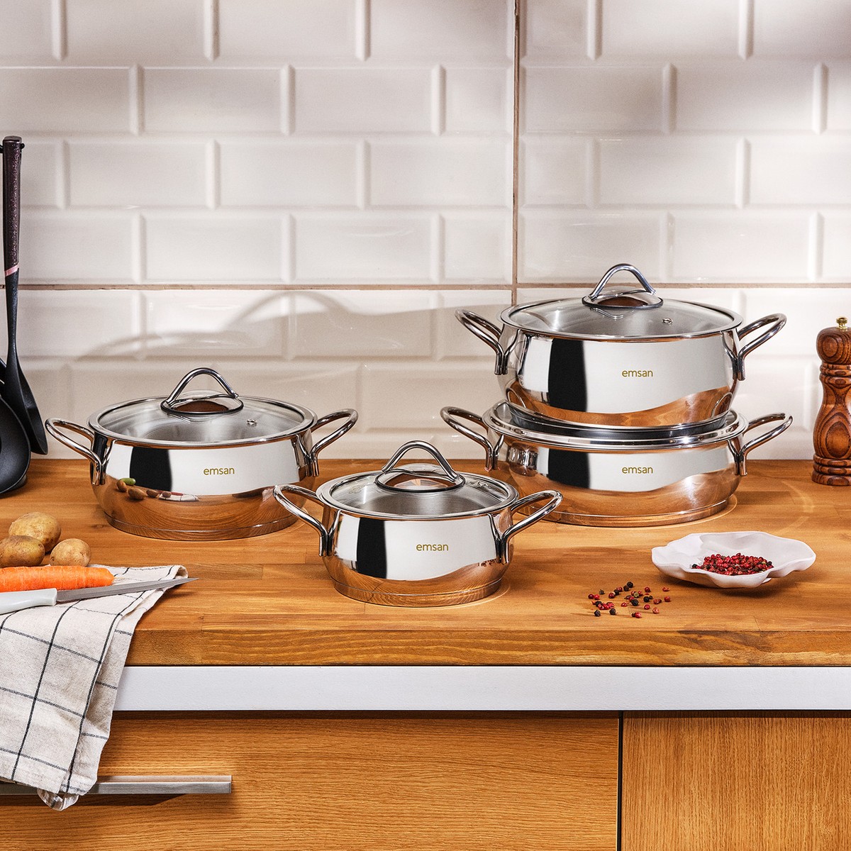 Emsan Cemre 8 Parça İndüksiyon Tabanlı Çelik Tencere Seti – Şıklık, Dayanıklılık ve Eşit Isı Dağılımı