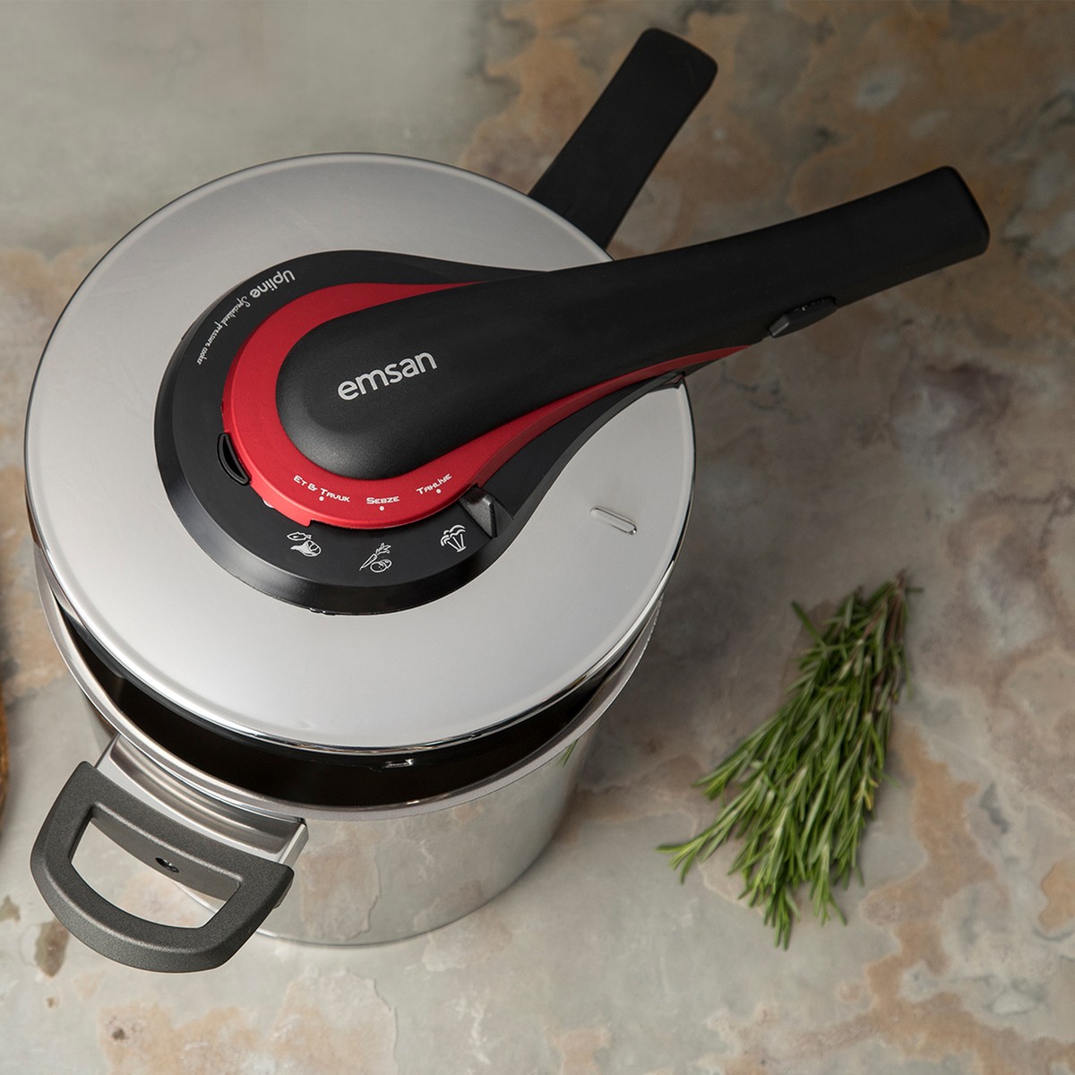 Emsan Up-line Kırmızı 4+6 Lt Klasik Paslanmaz Çelik Düdüklü Tencere Seti–Düdüklü tencerenin en gelişmiş hali… Pişirme programları sayesinde sebze, et, balık ve baklagilleri pişirirken ısılarını düzenler. Böylece gıdaların vitaminlerini ve lezzetlerini korur. Emniyet sistemleri farklı ve ergonomic açma kapama sistemi sayesinde güvenli ve kolay kullanım sağlar. Yemeğinizin pişme sürecini rahatlıkla takip edebileceğiniz basınç göstergesi mevcuttur. İç gövdede minimum ve maksimum göstergesi mevcuttur. Zamandan ve enerjiden tasarruf sağlar. Farklı ve ergonomik açma kapama sistemi kolay, hızlı ve güvenlidir. Geliştirilmiş taban sistemi sayesinde eşit ısı dağılımı sağlar. Daha pratiği yok! Değişebilen kapakları sayesinde aynı sette 4 ve 6 Lt. olarak 2 boy tencere, 2 boy düdüklü tencere kolaylığı… Hem düdüklü tencere kapağı hem cam tencere kapağı bulunan Up line setini ister düdüklü tencere, ister normal tencere olarak kullanabilirsiniz. Her tip ocakta kullanılabilir, Bulaşık makinesinde yıkanabilir. İçindekiler 4 Lt. Gövde 6 Lt. Gövde Düdüklü Kapak Cam Kapak Malzeme: 18/10 crNi Paslanmaz Çelik