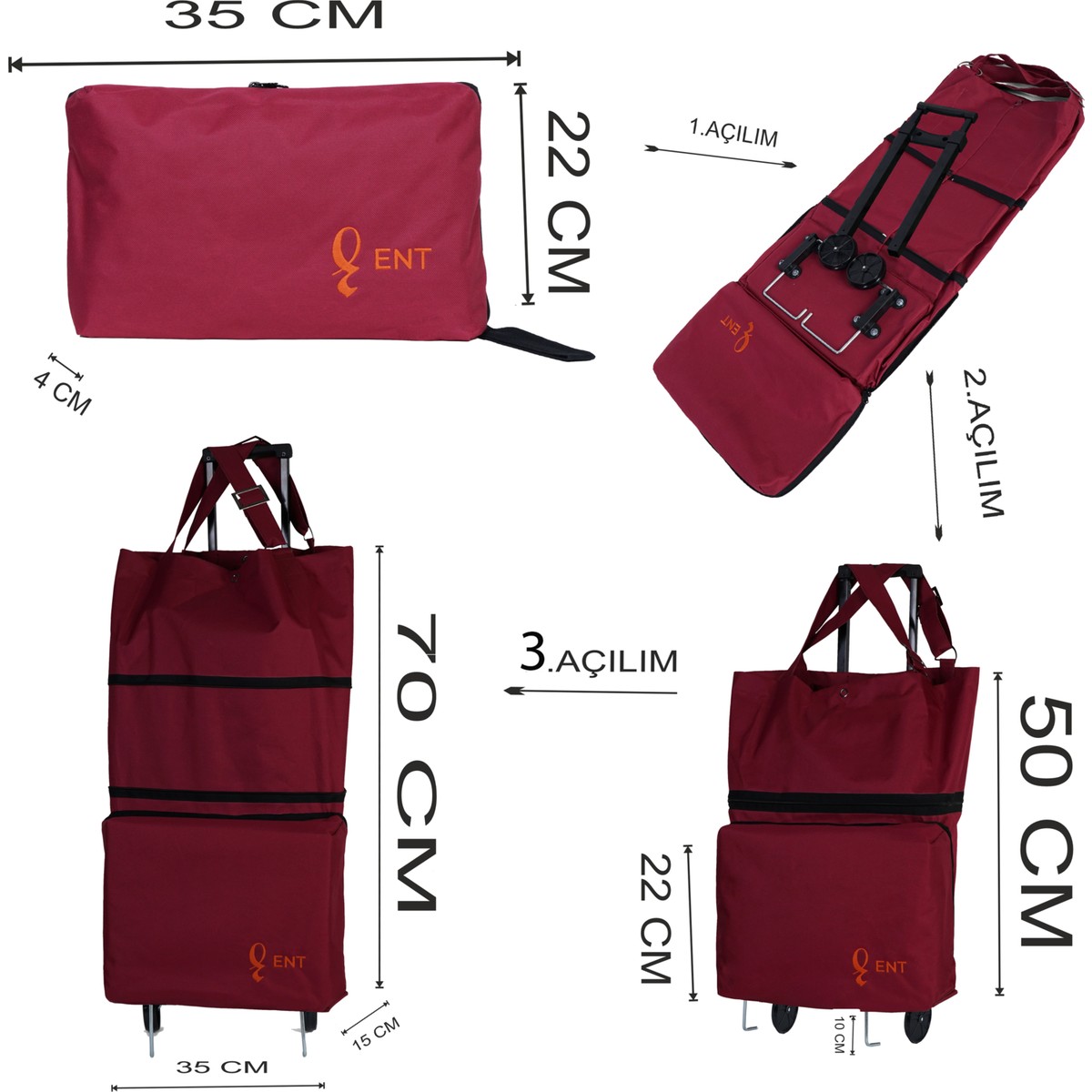 Ent Çanta MİNE Model Sessiz tekerlekli , Çok Fonksiyonlu, Katlanabilir Teleskobik Kollu Seyahat ve Alışveriş Çantası-Bordo