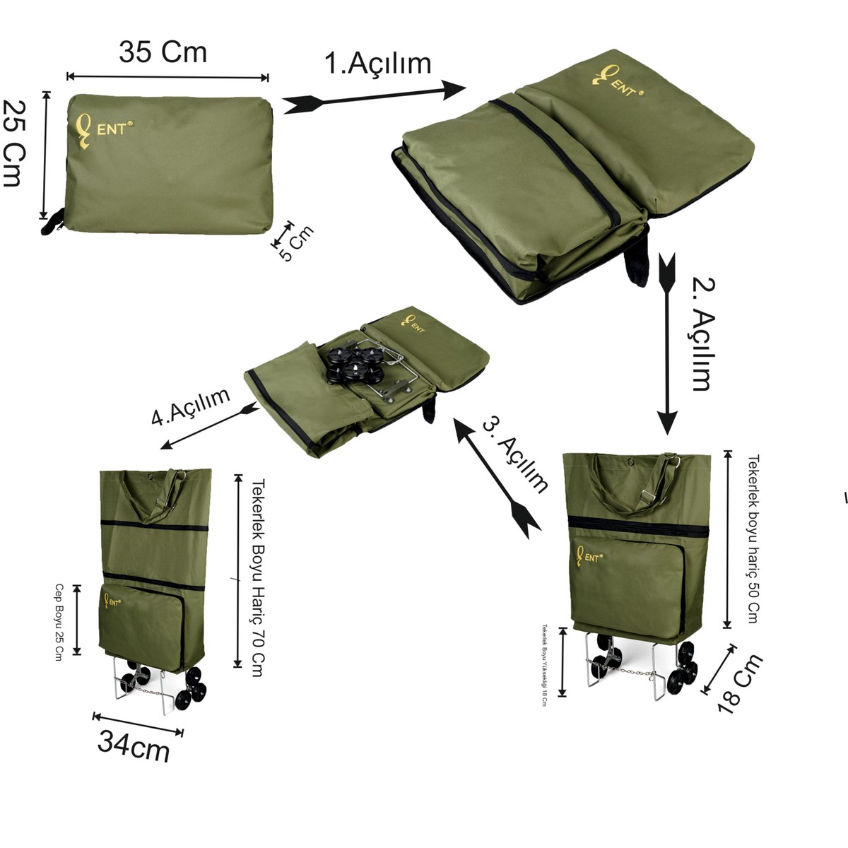 ENT CANTA MİLA Model Sessiz 6 Teker, Merdiven Çıkabilen, Katlanabilir Alışveriş ve Seyahat Çantası- Yeşil
