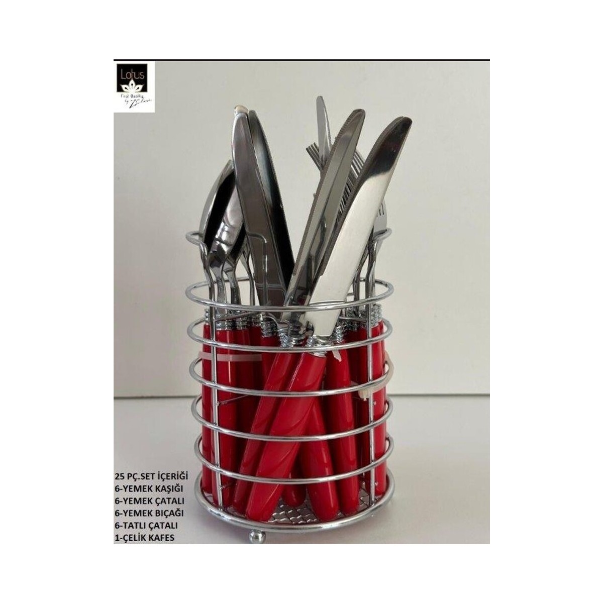 Kırmızı 25 Pç Çatal Kaşık Bıçak Takımı Çelik Sta Kafesli