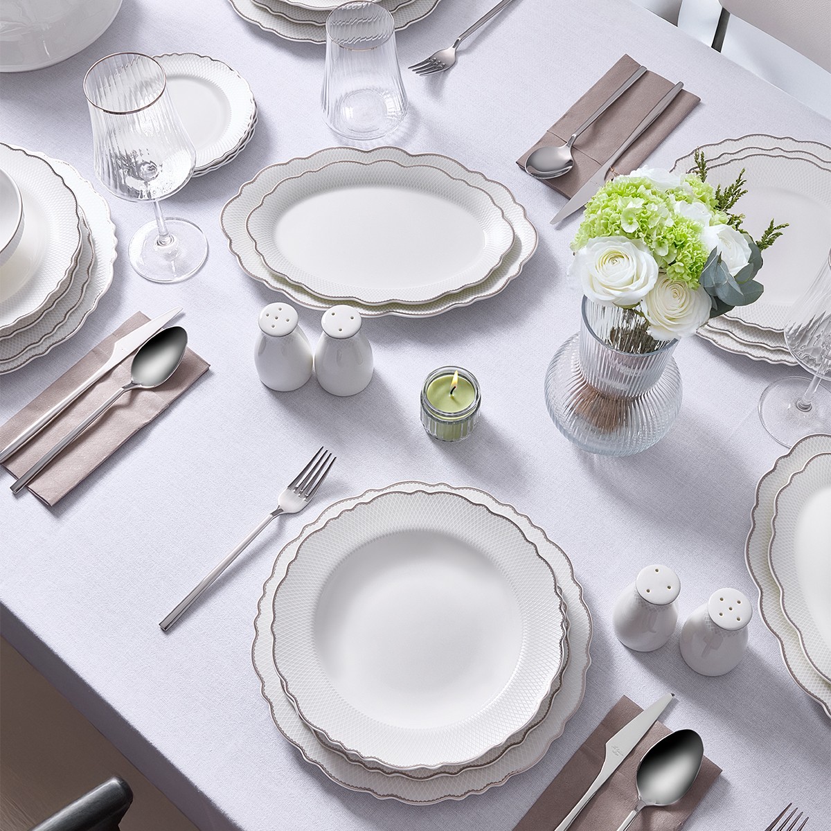 Platin detaylarıyla zenginleştirilen bu 12 kişilik porselen yemek takımı; davet sofralarınız, aile yemekleriniz ve özel kutlamalarınız için mükemmel bir seçimdir.