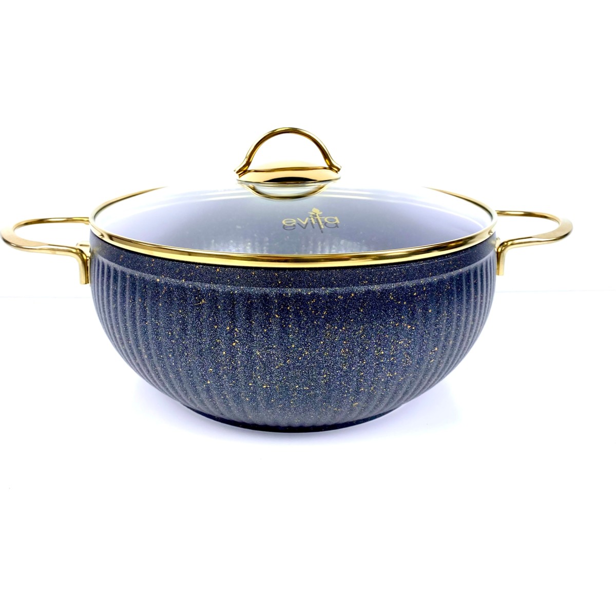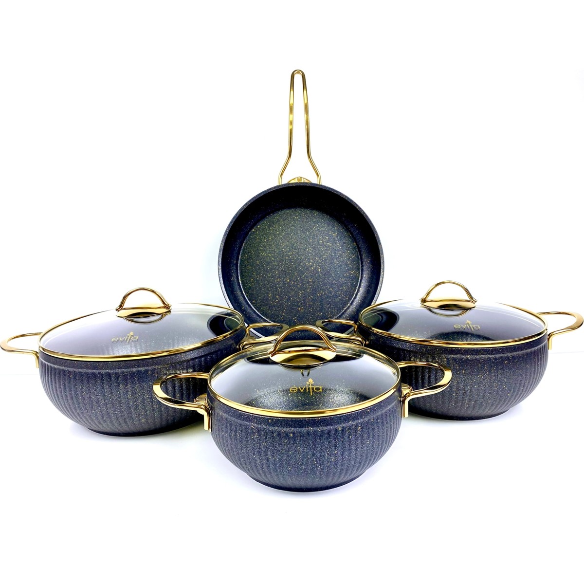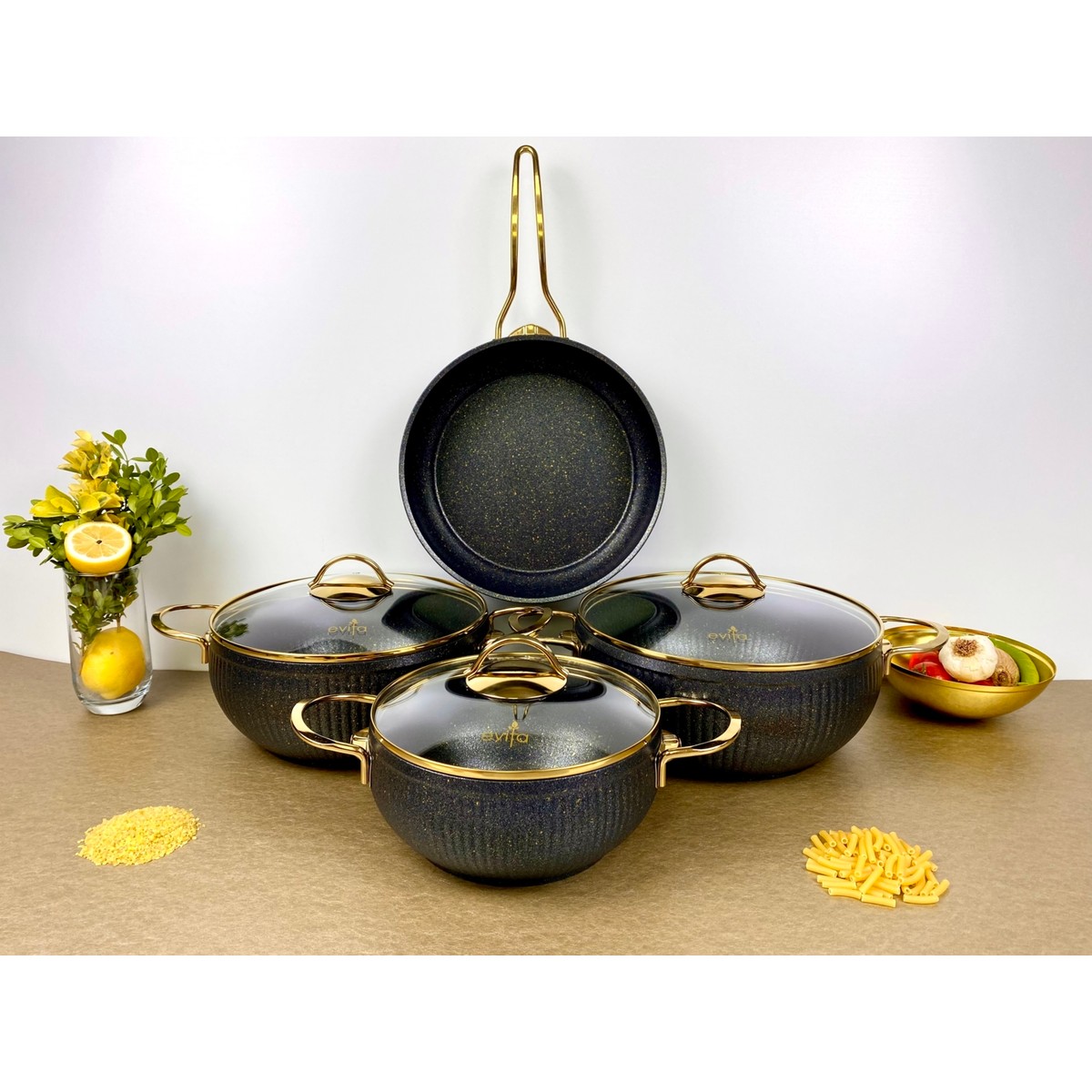 Evita İstiridye GOLD 7 Parça Siyah Granit Tencere Seti Kalınlık: 4,00 mm Ürün İçeriği; 1 Adet 20 cm Derin Tencere + Cam Kapak 1 Adet 24 cm Derin Tencere + Cam Kapak 1 Adet 26 cm Derin Tencere + Cam Kapak 1 Adet 26 cm Tava Evita, hem yurt içi hem yurtdışı birçok pazarda ürünkalitesinden katiyen taviz vermeyen bir markadır. Evita Gold Granit Serisi son kullanıcılar için sorunsuzşekilde pişirim imkanı sunmak adına özenle tasarlanmış ve dayanıklılık esasalınarak siz değerli kullanıcılarımızın beğenisine sunulmuştur. Evita Gold Granit Serisi; 3 kat iç 3 kat dış kaplama olmak üzere toplam 6 kat granitkaplama kullanılmıştır. Ürünlerimizde kullanılan kaplama malzemesi Titanyumnanopartikülleri ile desteklenerek çizilmeler karşısında %40 oranında dahafazla dayanıklılık sağlamaktadır. Ani ısı değişimleri, korozyon, çizilme ve kimyasalfaktörlere karşı dirençlidir. Yanmış Süt Testi, Tuzlu Su Testi ve Çapraz Kesme Testi gibiuluslar arası standartlar parametrelerine uygun olarak üretilmiştir. Yüksek ısıl iletkenlik özelliği sayesinde enerji tasarrufusağlamaktadır. Spiral taban teknolojisi sayesinde optimal ısı dağılımınaimkan tanımaktadır. 250°C’ye kadar ısıya dayanıklıdır, yapısal bozukluğa uğramaz. PFOA (Perflorooktanoikasit) gibi potansiyel kanserojenikmadde içermez. Kurşun, Kadmiyum,Krom ve Cıva gibi ağır metaller içermez. Yanmaz yapışmaz kaplama sayesinde yağ kullanımını minimizeeder. Kolay temizlenebilir, bulaşık makinesinde yıkamaya uygundur. Geri dönüştürülebilir yapısı gereği çevre dostudur. Kullanılan gold kaplama metal kulplar doğrudan ısı kaynağınamaruz kalmadığı müddetçe ısınmaz ve yapısal bozukluğa uğramaz.