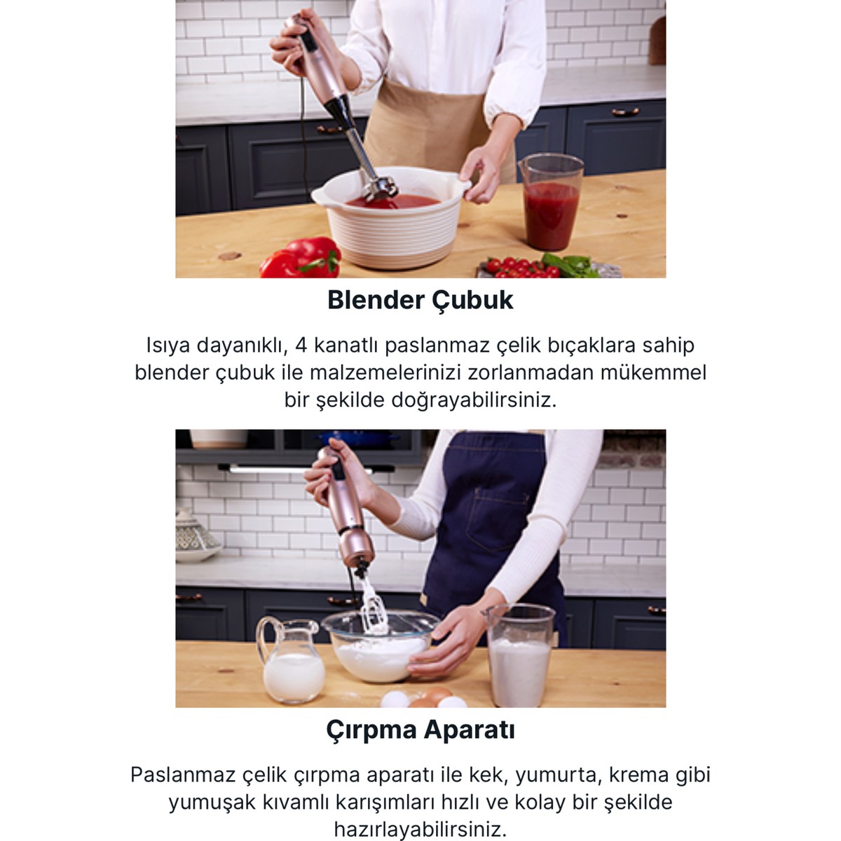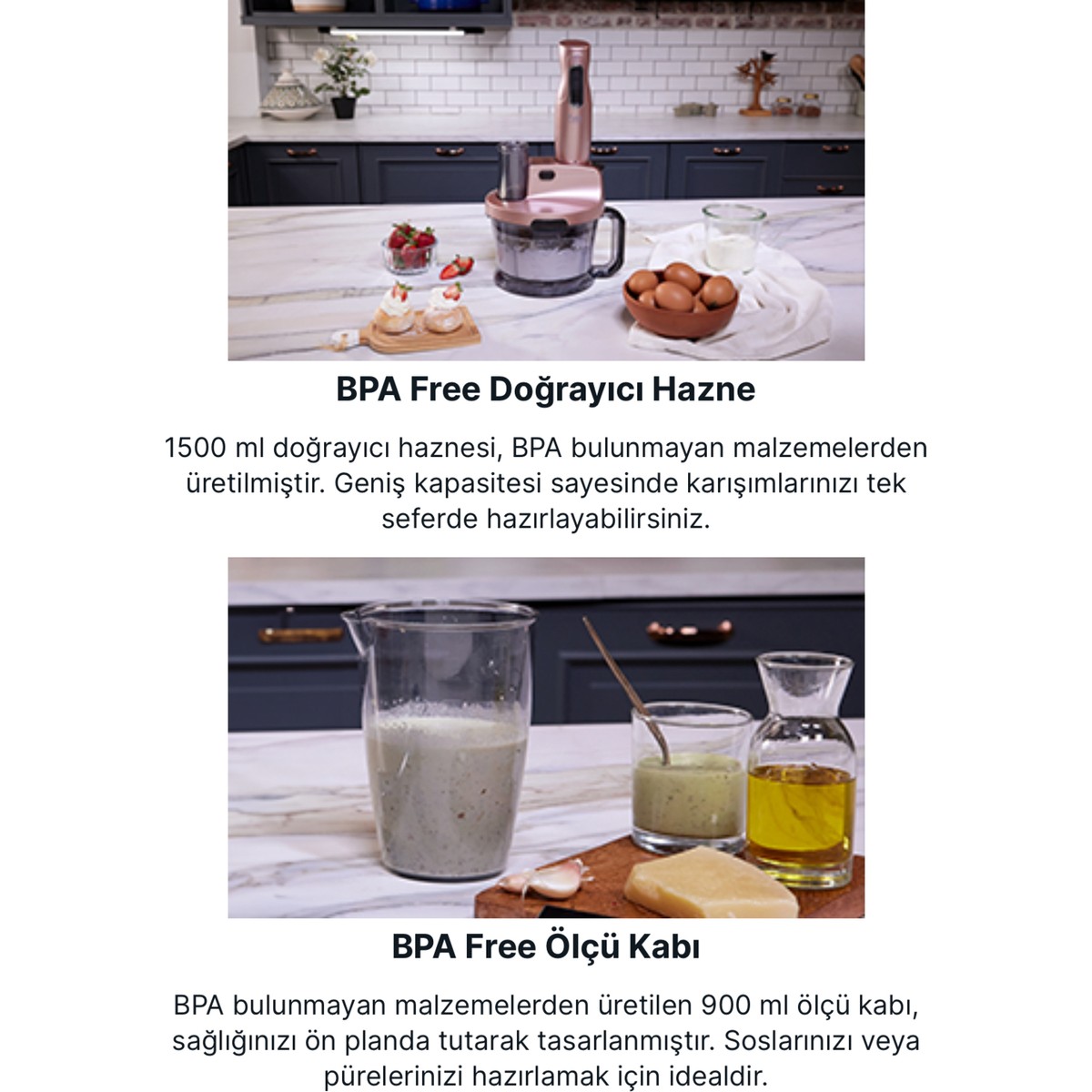 Buz kırabilen blender özelliği ile buzların kırılmasını sağlar. Aynı zamanda blender, çırpma, dilimleme, doğrama, karıştırma, rendeleme fonksiyonlarına sahiptir.