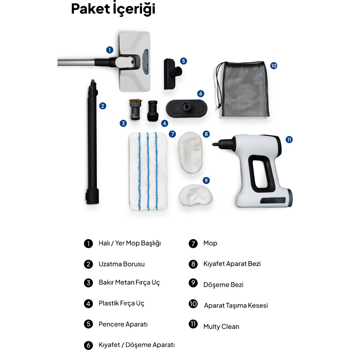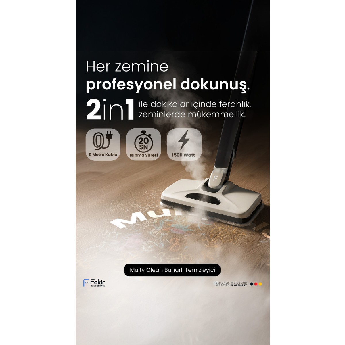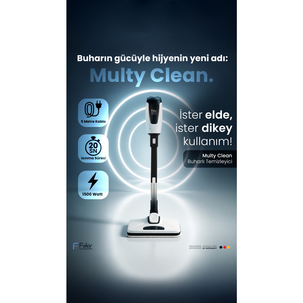 Fakir Multy Clean Buharlı Temizleyici, evinizdeki tüm yüzeylerde kimyasal madde kullanmadan hijyen sağlar. 1500 Watt gücündeki motoru sayesinde saniyeler içinde buhar üretir ve zorlu lekeleri kolayca söker. Parke, fayans, halı, cam, mutfak ve banyo yüzeylerinde etkili temizlik sunar.