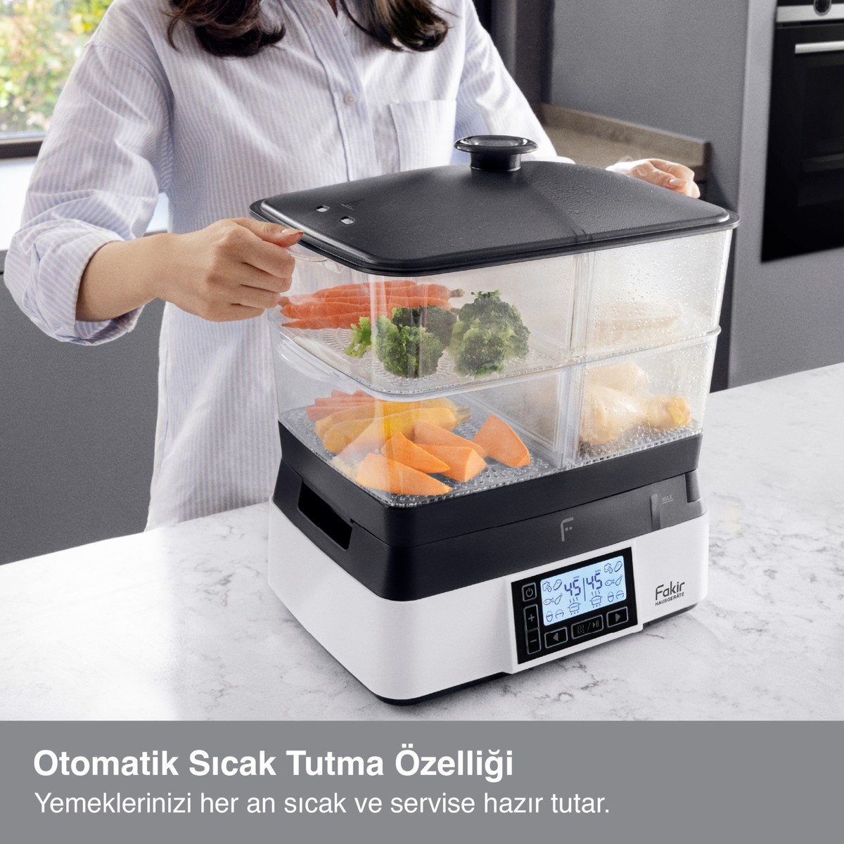 Fakir Premium Steam Buharlı Pişirici, 1800 W güçlü motoru ve 11 L geniş haznesi ile sağlıklı ve lezzetli yemeklerinizi hızlı ve pratik bir şekilde hazırlamanızı sağlar. Sebze, tavuk, balık gibi besinlerin vitamin ve minerallerini korur ve tam kıvamında pişirir. Otomatik kapanma özelliği, kullanıcılara güvenli bir deneyim sunarken sesli uyarı sistemi pişirme sürecinizi adım adım takip etme imkânı sağlar. Yiyeceklerinizi buharda pişirerek hızlı sonuçlar alabilir, yumuşak ve tam kıvamında lezzetler elde edebilirsiniz.