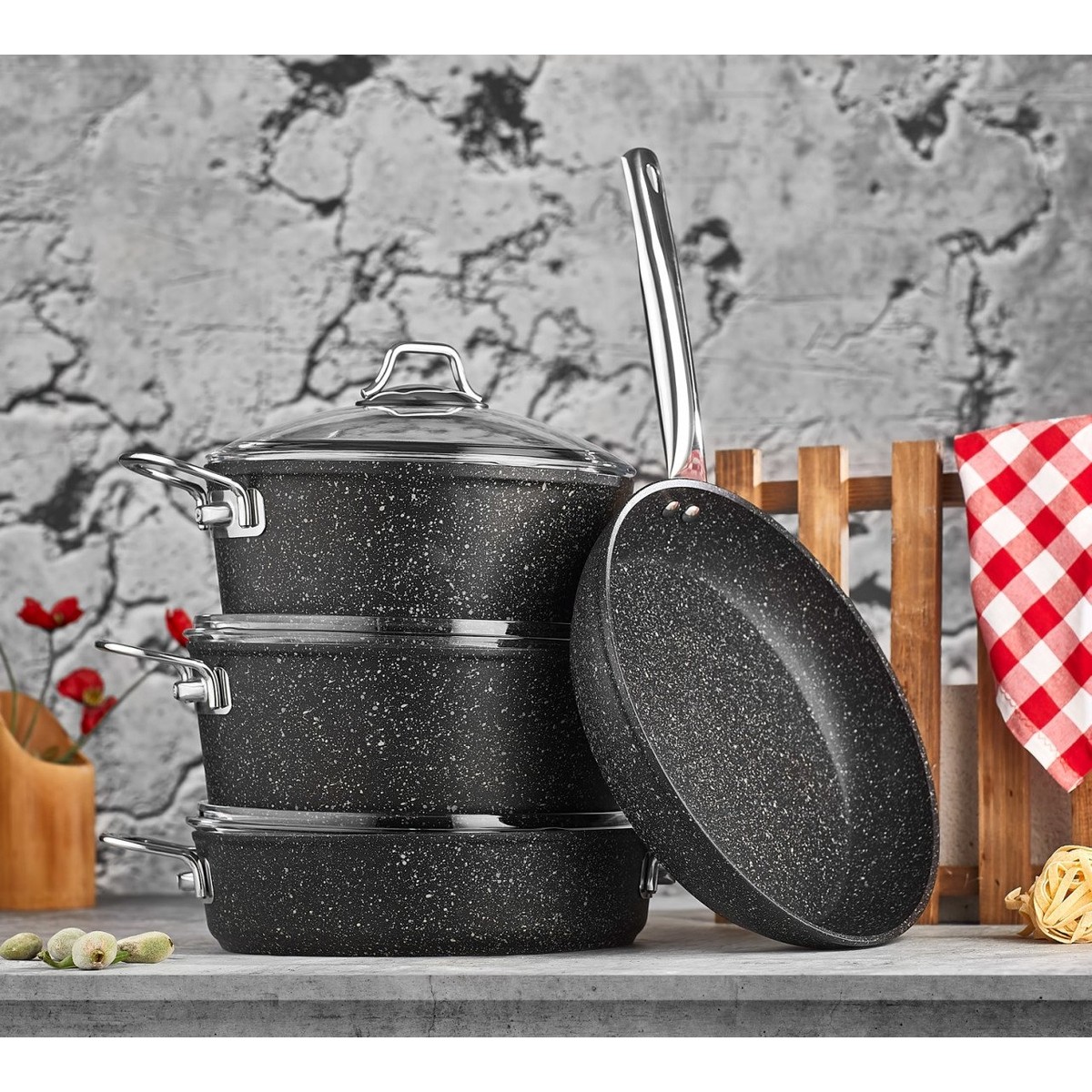 SET İÇERİĞİ GRANiT 20 cm Derin Tencere 24 cm Derin Tencere 26 cm Kısa Tencere 26 cm Tava