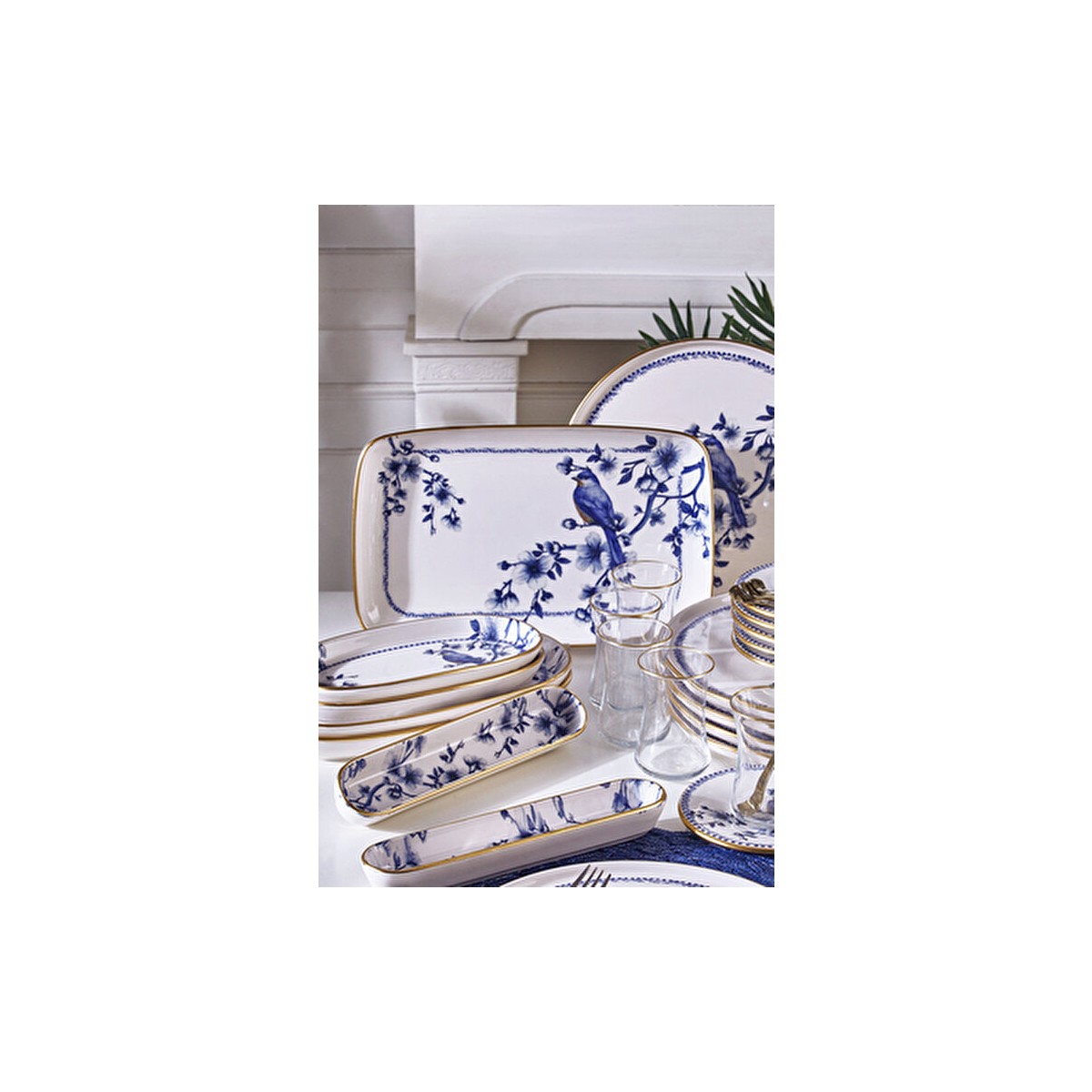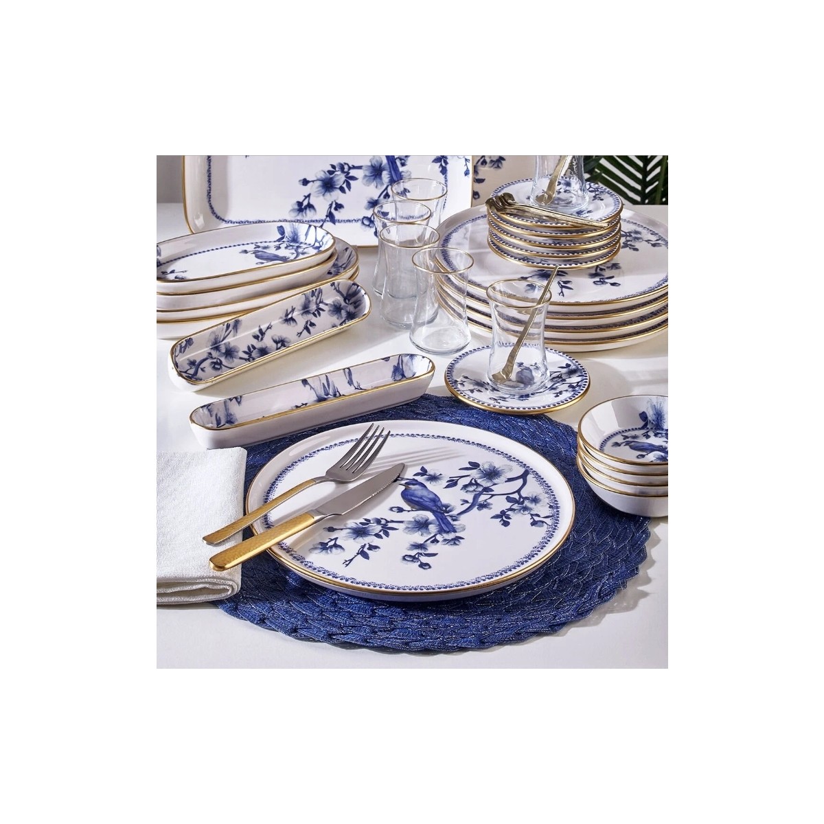 Fecra Blue Bird Kahvaltı Takımı 35 Parça 6 Kişilik Mavi Beyaz Stoneware Gold Detaylı