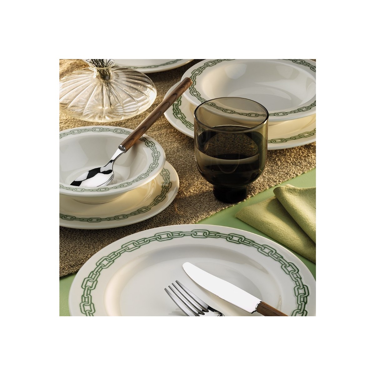 Fecra Rante 24 Parça Yemek Takımı, sofralarınıza zarafet ve şıklık katmak için tasarlanmıştır. Beyaz porselenin zarif dokusuna, beyaz üzerinde yeşil zincir desenler eşlik ederek sıra dışı bir hava yaratır. Yuvarlak şekli ise klasik ve estetik bir duruş sunar.