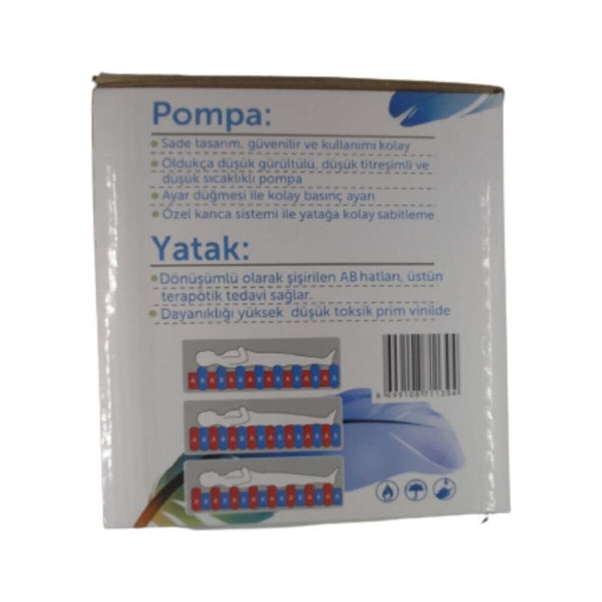 Senkronize Çalışan Motor İle Güçlü Alternatif Hava Basınç Sistemi 5 Dakika İçinde Daire Şeklinde Hava Dolaşım Sistemi Yatak Üzerinde Çift Hava Yolu Sistemi Çift Yollu Hava Sistemi İle Vücudun Belirli Bölgesine Hava Verilirken Diğer Bölgelerdeki Hava Basıncı Düşürülerek Hasta Hareket Ettiği Taklidi Yapılır, Bununla Oluşabilecek Yatak Yarası Ve Deri Ülseri Önlenir. Özellikler: · Ayarlanabilir Hava Akışı · Güç Kaynağı 50hz / 220v · Hava Dolaşım Süresi 5 Dakika · Düşük Risk Cilt Ülseri Koruma Sistemi · Pvc Hava Kabarcığı Şilte İle 2 Hava Boru Sistemi · Basınç Oranı 25 Kpa · Hava Akışı 5 Lt / Dak · Şilte Üzerinde 130 Hava Balonu · Anti Yel Pvc%27den Şilte · Kablo Uzunluğu 3 Metre İçerik: Hava Pompası Hava Yatağı Çift Hava Hortumu Pvc Tamir Seti Tutkalla 2yıl li