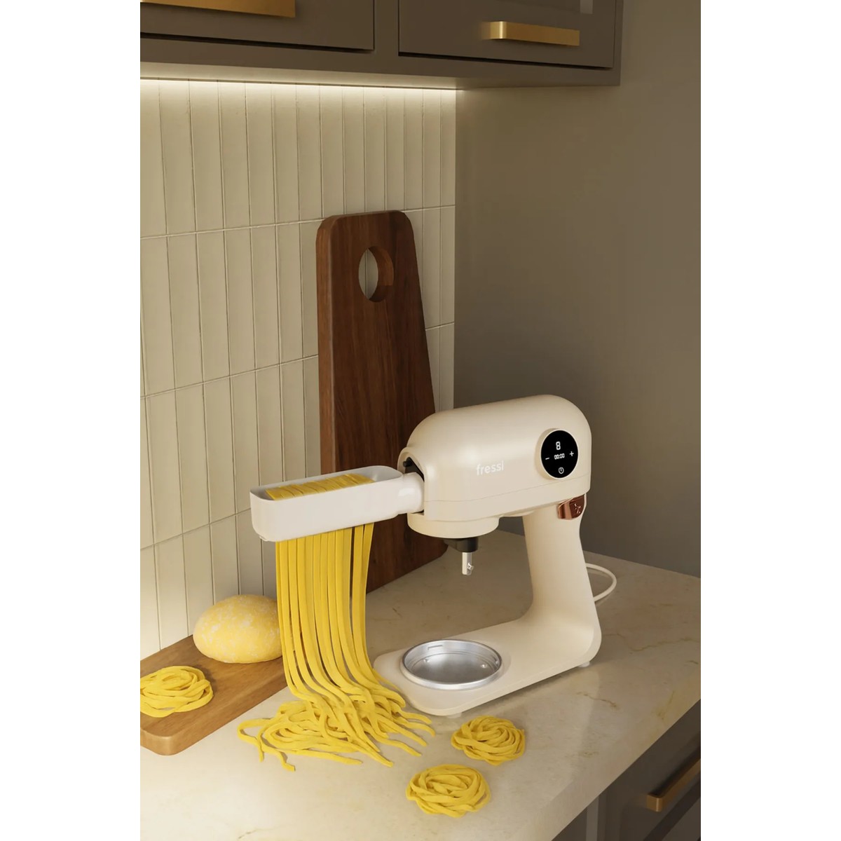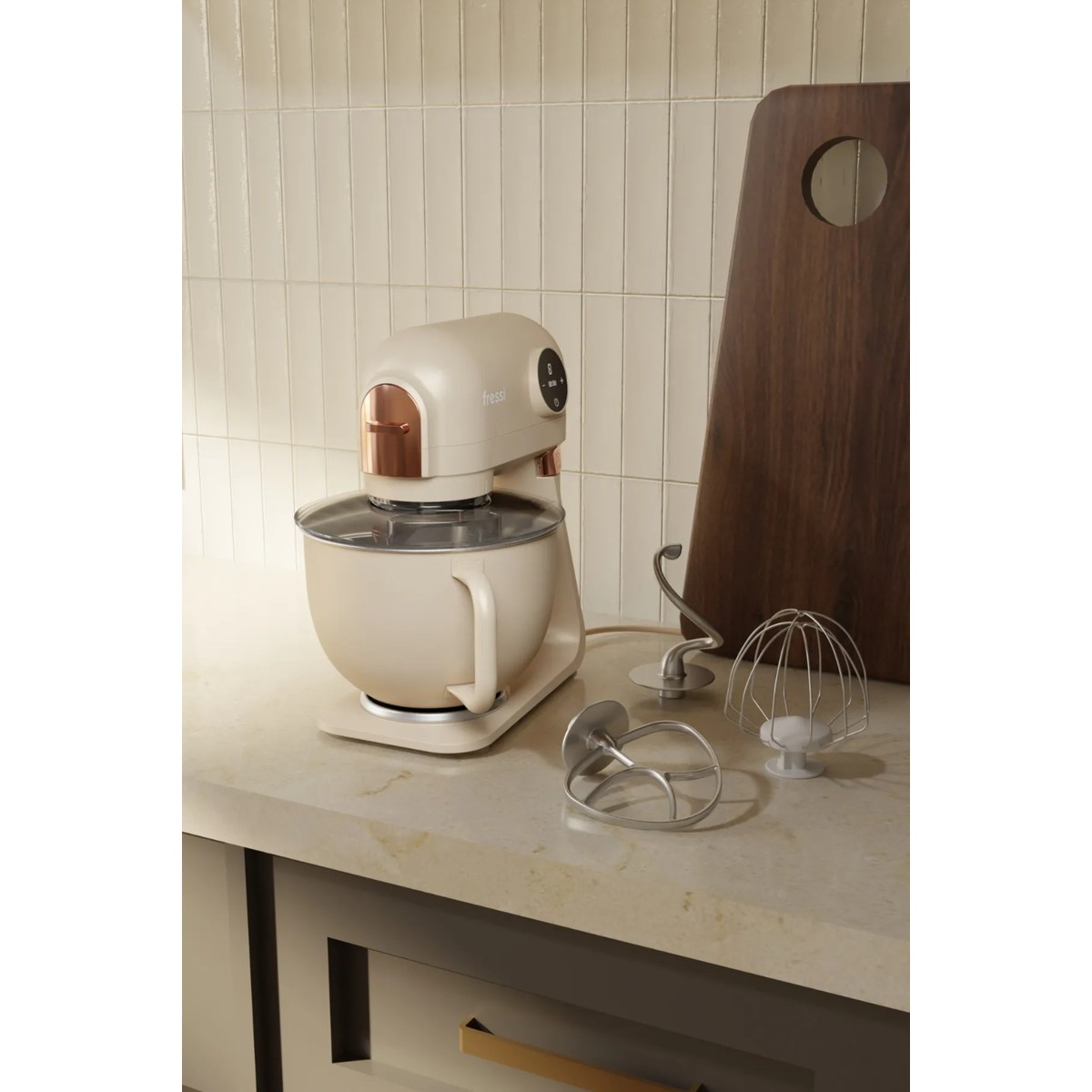 Fressi FR-SM2503 Allegro Hamur Yoğurma Mikseri – Mutfakta Gücünüz Olsun! 1500W gücüyle profesyonel performans – 5L paslanmaz çelik hazne – Zengin aksesuar setiyle birlikte! Mutfakta işlerinizi kolaylaştırmak ve ustalıkla yoğrulmuş hamurlar elde etmek için tasarlanan Fressi Allegro, güçlü 1500W AC motoru, sağlam alüminyum döküm gövdesi ve zengin aksesuar seçenekleriyle evinizin yeni mutfak şefi olacak.; ???? Şık ve Dayanıklı Tasarım Premium alüminyum döküm gövde Krem ve yeşilrenk seçenekleriyle mutfağınıza zarif bir dokunuş Altın kaplamaön kapak ve başlık kaldırma tuşu ile estetik görünüm ⚙️ Yüksek Performanslı Teknik Özellikler 220V–240V, 50/60Hz uyumlu – 1500W güçlü AC motor 5 litrelikgeniş paslanmaz çelik karıştırma haznesi (gövde renginde özel boyalı) 3 farklı karıştırma aparatıylatam donanım: Çırpıcı:Paslanmaz çelik teller ve enjeksiyon kapaklı Karıştırıcı ve Hamur Kancası:Sağlam alüminyum döküm ???? STANDART KUTU İÇERİĞİNE EKSTRA HEDİYE! Bu ürünle birlikte, hamur açma ve makarna kesme aparatı HEDİYEolarak kutu içeriğinde sunulmaktadır! ????‍???????? ???? Opsiyonel Aksesuar Seçenekleri (Ek ücretle satın alınabilir) İster et kıyın ister salata doğrayın! Ürününüzü çok daha fonksiyonel hale getirecek aksesuarlar: Kıyma makinesi aparatı (Salam/sosis/sucuk doldurma aparatı ile beraber) Salata doğrama aparatı Bu aksesuarları opsiyonel olarak satın alarak tek bir cihazla sayısız işlemgerçekleştirebilirsiniz.; ???? Güvenli Kullanım VDE uyumlu fiş Sabit duruş için kaymaz taban Aşırı ısınma korumalı motor sistemi Fressi Allegro ile mutfağınızda profesyonel sonuçlar artık çok daha kolay! Hamur işlerinden makarnaya, kıymadan salataya kadar tüm işlemleri tek cihazla tamamlayın.