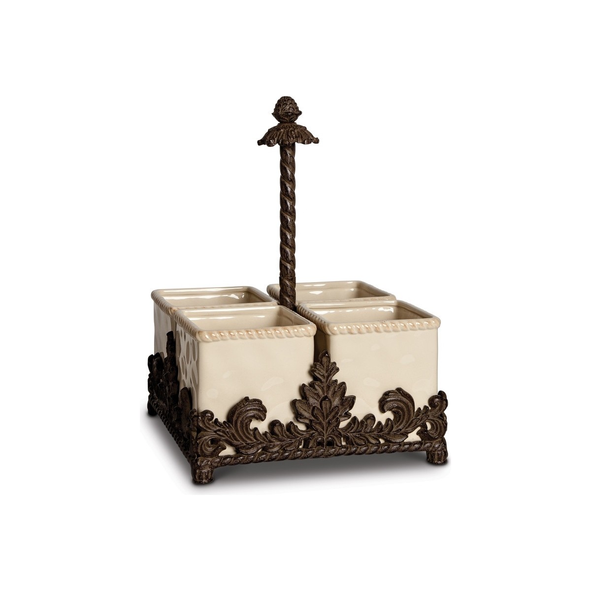 Bu caddy kullanışlı olduğu kadar güzel. Bu çekici kulplu tepsi, en sevdiğiniz sofra takımlarınız için tasarlanmış, ancak mumlar, peçeteler ve çiçekler için de kullanılabilen dört seramik kap içerir. Çıkarılabilir seramik kaplar bulaşık makinesinde yıkanabilir. ÖZELLİKLER Boyutlar : 23 cm gx 23 cm dx 31,7 cm h, her bir seramik parça 11,43 cm kare Ağırlık: 3,24 kg Kaplama : Yalnızca Krem renginde mevcuttur Malzeme : Seramik ve alüminyumdan el yapımı İçerik: Metal taban ve dört seramik kutu Notu : Bu serideki tüm kaplamalar el yapımıdır ve her bir parçanın benzersiz karakterini yansıtan renk varyasyonlarıyla sonuçlanır.