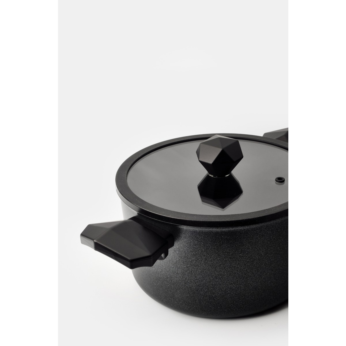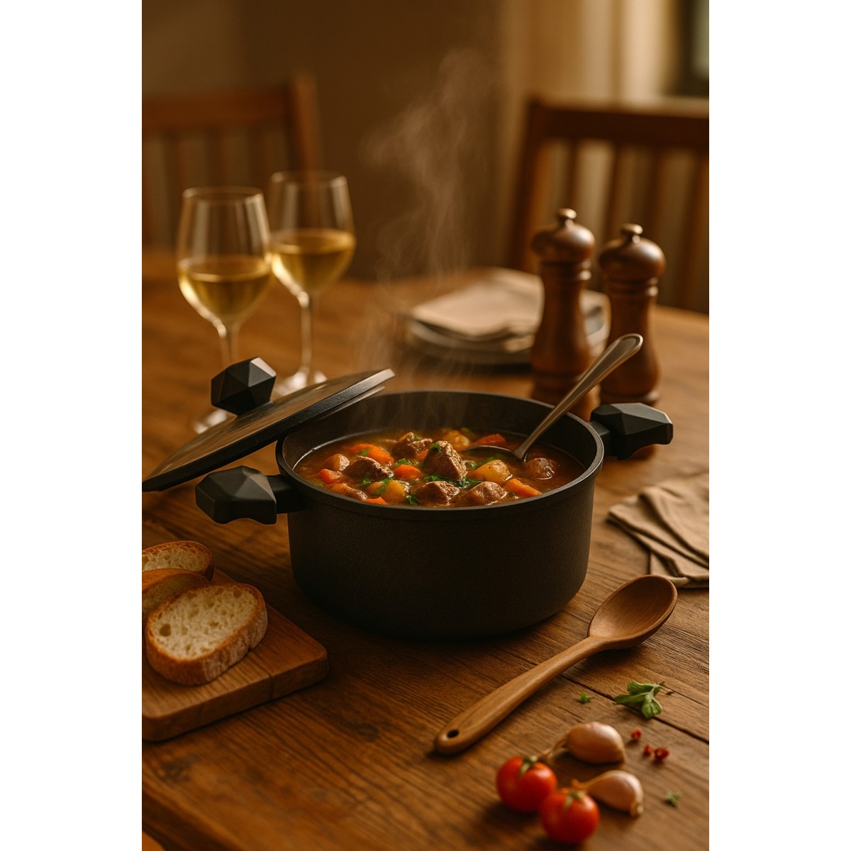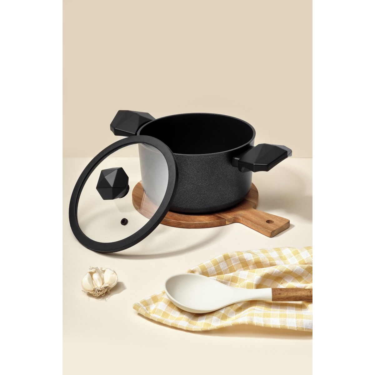 24 cm derin tencere, büyük porsiyonlu yemekler, çorbalar, haşlamalar ve güveçler için ideal genişlikte olup, mutfakta çok yönlü kullanım sağlar. Isıya dayanıklı cam kapak sayesinde pişirme süreci rahatlıkla takip edilir, buhar çıkışı özelliği ise taşma riskini en aza indirir.
