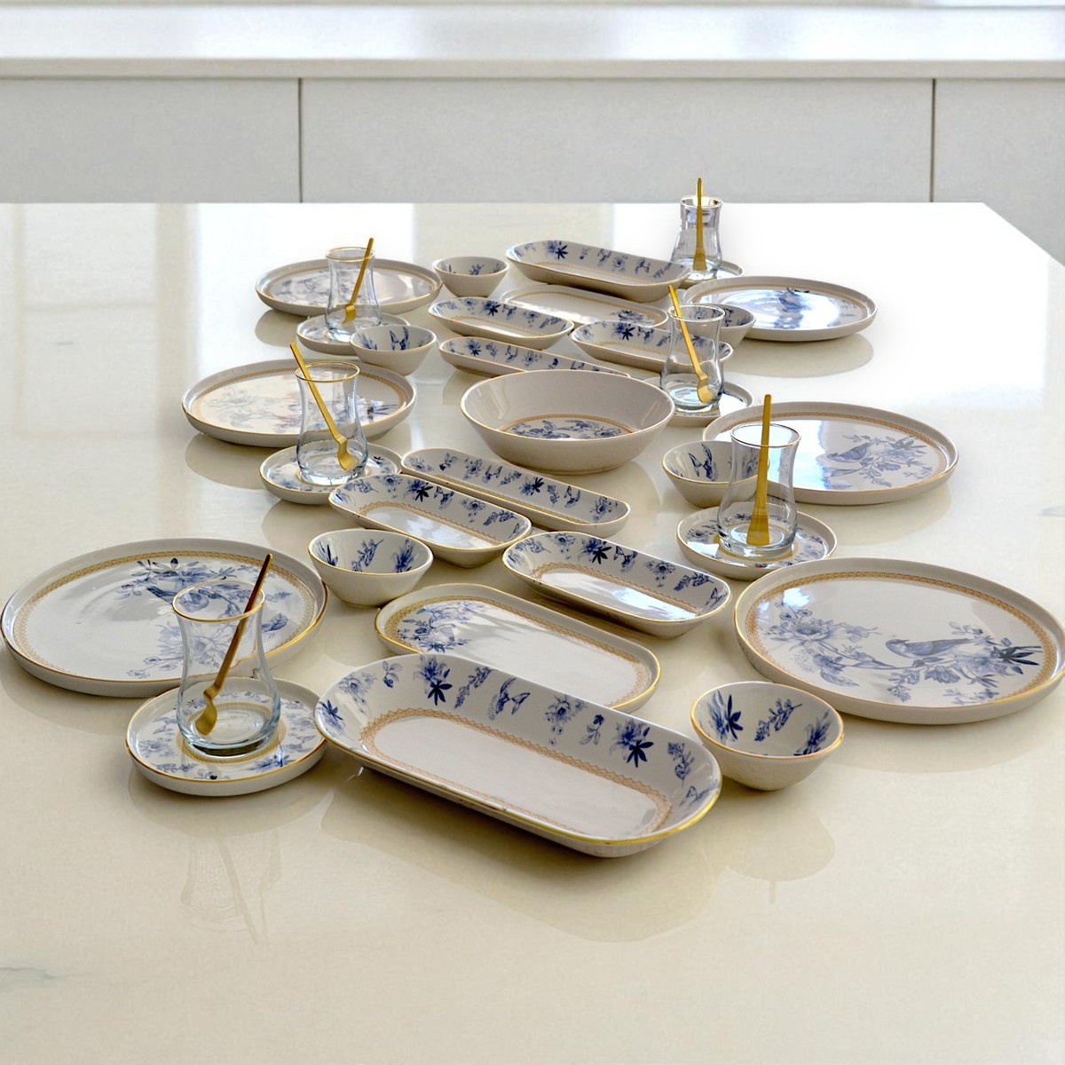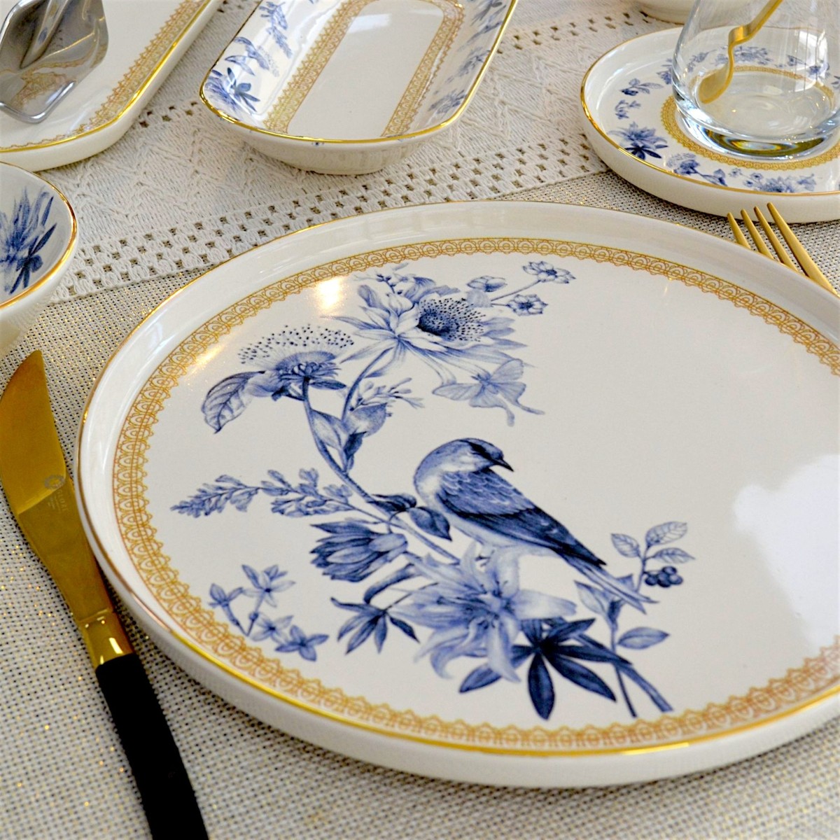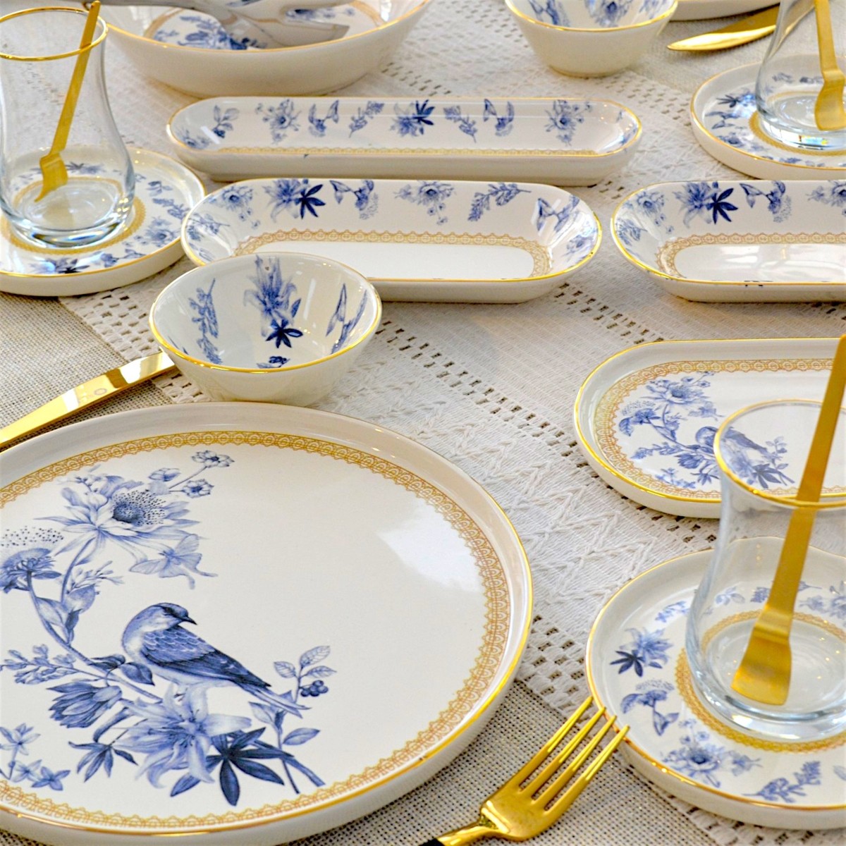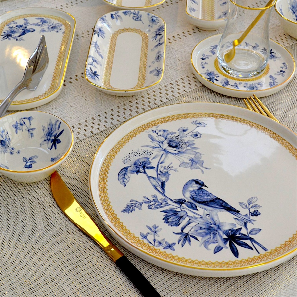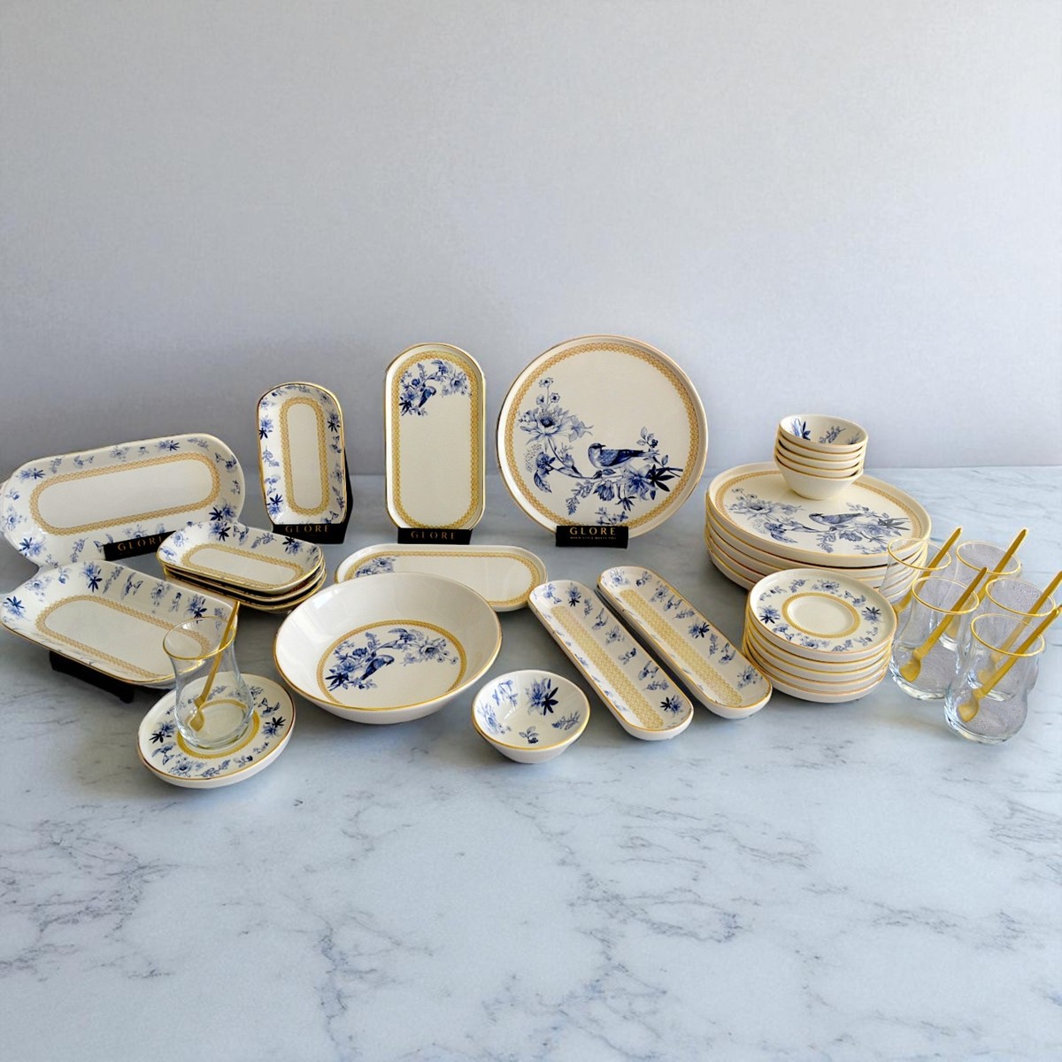Glore Mavi Kuş 41 Parça 6 Kişilik Altın Yaldızlı Seramik Kahvaltı Takımı