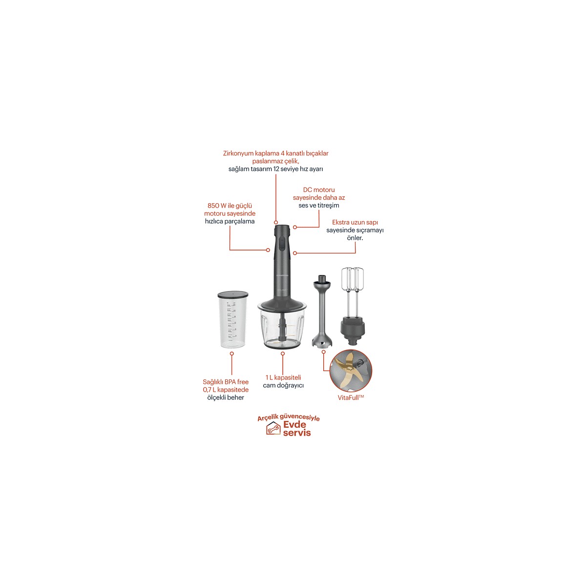 Ürünün kalitesi gerçekten üst düzey. Daha elinize aldığınızda ağırlığından kullanılan malzemenin kalitesini anlıyorsunuz. Sessis çalışması, bıçaklarının 4 adet oluşu, cam kase için titreme önleyici olarak konulan lastik tava; hepsi ince düşünülmüş ayrıntılar.