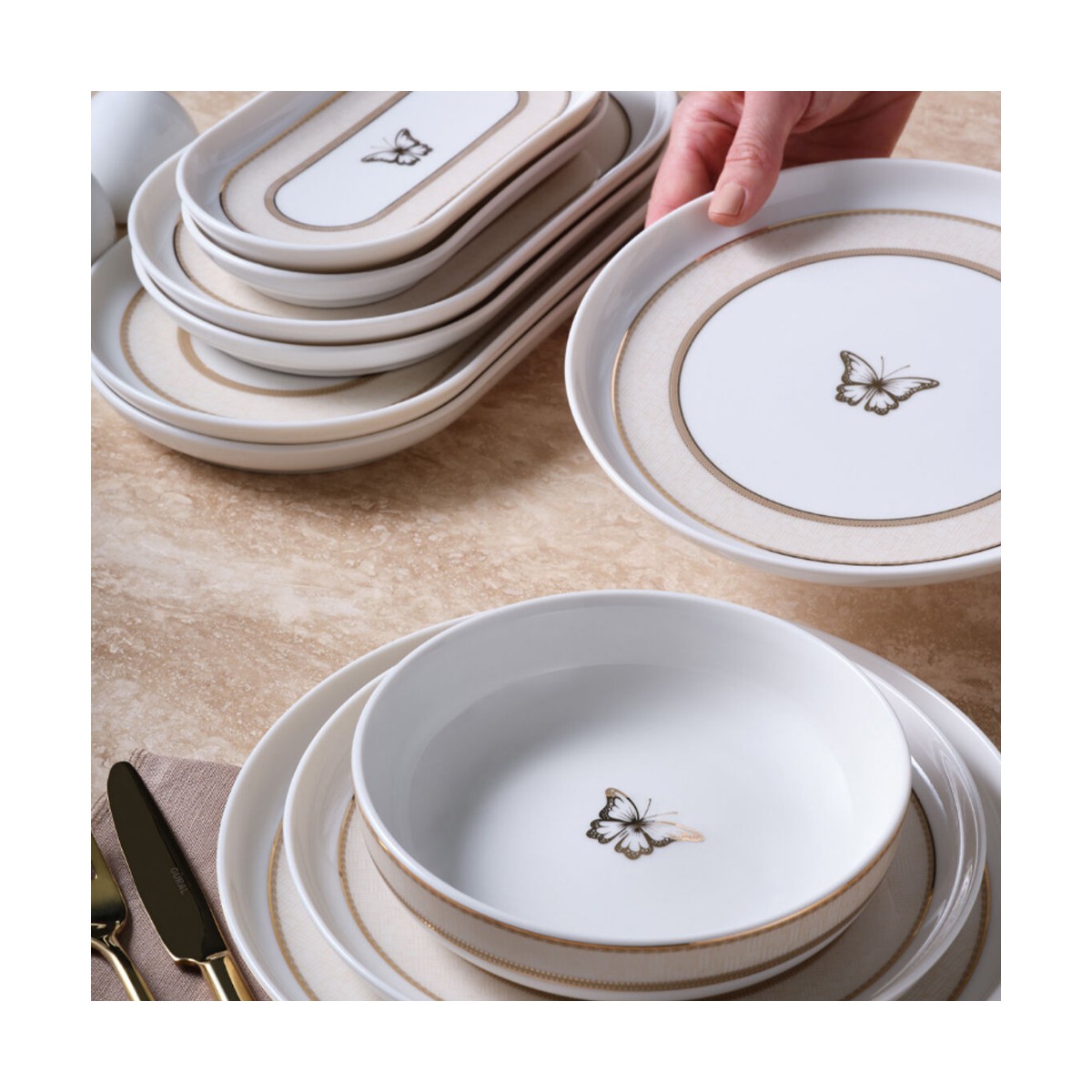 “Bibao serisi, modern desenleri ve çağdaş tasarımı ile günümüz trendlerine uygun bir stil sunmaktadır. Her bir parçanın özenle seçilmiş olması, sofralarınıza benzersiz  bir estetik ve işlev getirmektedir. Sunumlarınızda fark yaratacak doğal bir dokunuş ve modern şekli ile 30 Parça, 6 Kişilik Yemek Takımı karşınızda!”