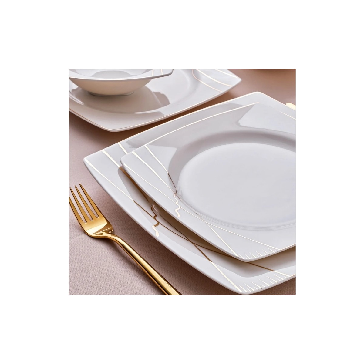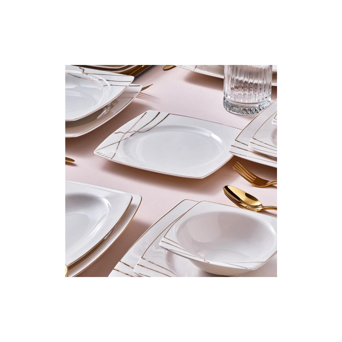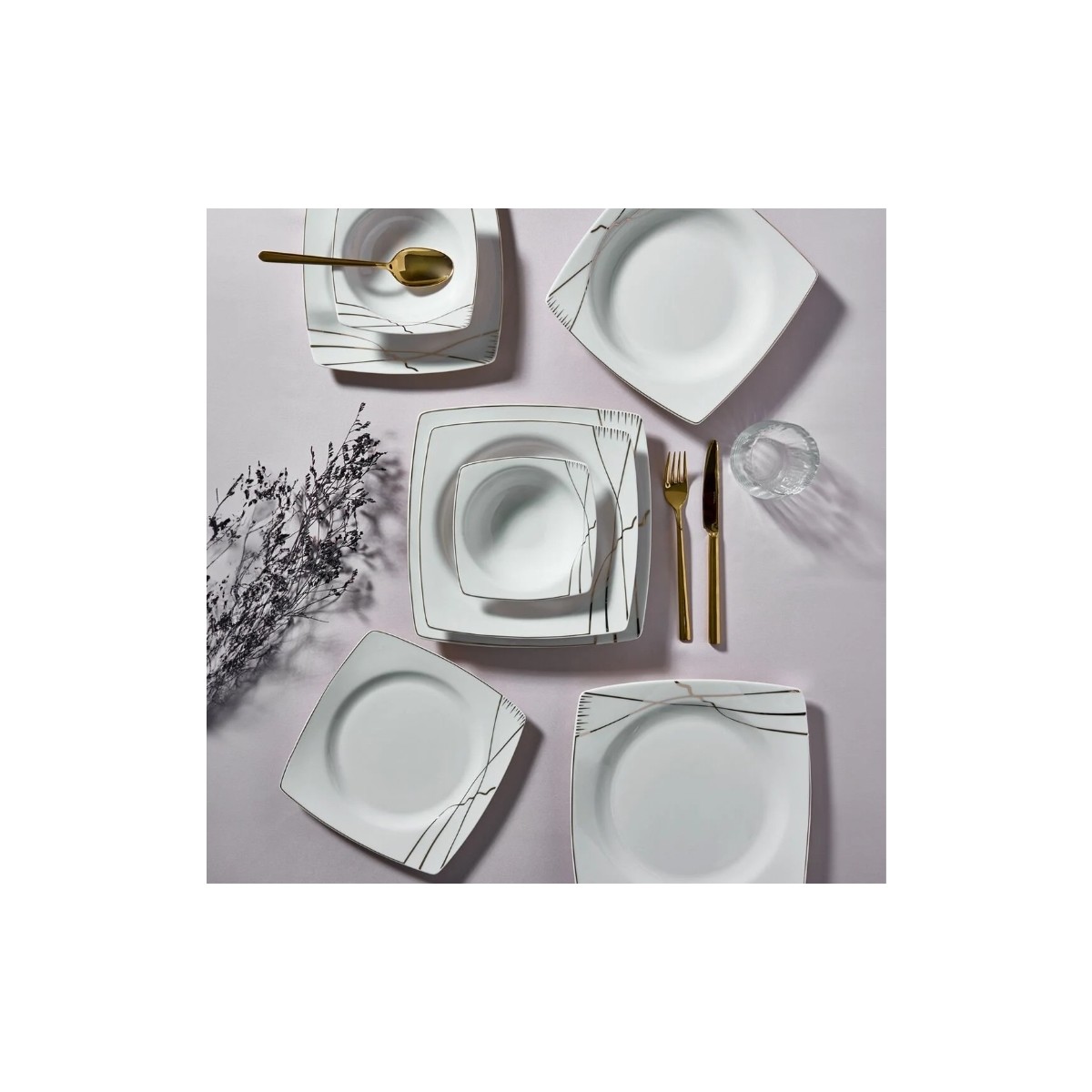 Modern Şıklık, Dört Dörtlük İçerikSet içeriği:6 Adet 15×15 cm Kase6 Adet 21×21 cm Pasta Tabağı6 Adet 23×23 cm Çukur Yemek Tabağı6 Adet 26×26 cm Servis Tabağından oluşmaktadır.Malzeme: PorselenParça Sayısı: 24 ParçaKişi Sayısı: 6 KişilikForm: Kare