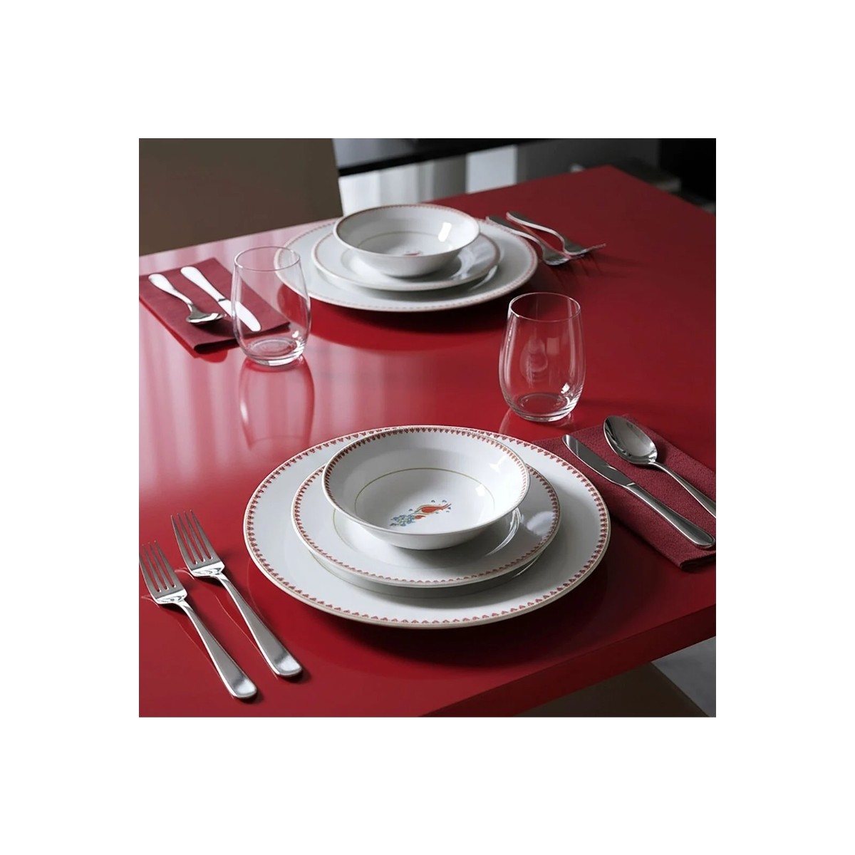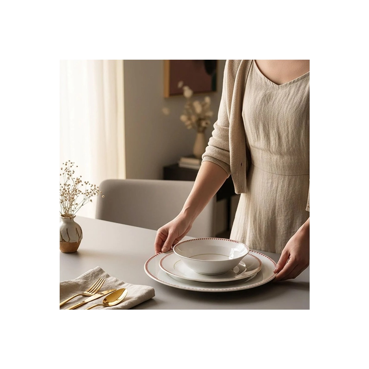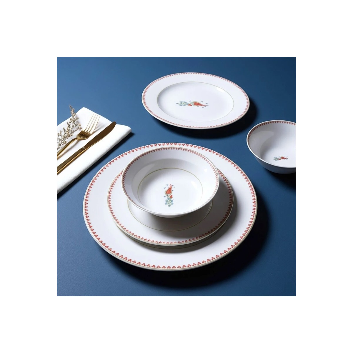 Gelenekselin Zarafeti SofralarınızdaGüral Porselen Yonca 24 Parça Yemek Takımı, ince kırmızı desenleri ve ortadaki çiçek motifleriyle sofralarınıza nostaljik ama modern bir dokunuş getiriyor. Her bir parça, hem sadeliği hem de detaylı işçiliğiyle göz alıcı bir uyum yaratıyor.Klasikten İlham Alan Zamansız DesenlerKenarındaki kırmızı detaylar ve iç motiflerdeki zarif çiçek figürleri, sofralarınıza geleneksel bir sıcaklık katarken modern çizgilerle dengeleniyor. Bu sayede hem geçmişten ilham alıyor hem de günümüz sofralarına uyum sağlıyor.6 Kişilik Tam Set Konforu24 parçadan oluşan bu set, 6 kişilik sofralar için eksiksiz bir düzen sağlıyor. Çorba kasesinden servis tabağına kadar her ayrıntı düşünülmüş; hem günlük sofralarda hem de misafirlerinize hazırlayacağınız özel davetlerde size kusursuz bir sunum imkanı veriyor.Kültür ve Modernliğin BuluşmasıLale motifleri geleneksel bir incelik taşırken, minimalist kırmızı desenler seti çağdaş bir çizgiye taşıyor. Böylece hem özel davetlerde hem de günlük sofralarda farklı bir kimlik yaratıyor.Porselen GüvencesiKaliteli porselen dokusu, uzun yıllar boyunca şıklığını korurken dayanıklılığıyla da ön plana çıkıyor. Estetik ve sağlamlığı bir arada sunan bu set, sofralarınızın en gözde parçası olacak.Ürün BilgileriMalzeme: PorselenParça Sayısı: 24 ParçaKişi Sayısı: 6 KişilikSet İçeriği:6 Adet Servis Tabağı – 24 cm6 Adet Çukur Yemek Tabağı – 21 cm6 Adet Pasta Tabağı – 21 cm6 Adet Kase – 15 cm
