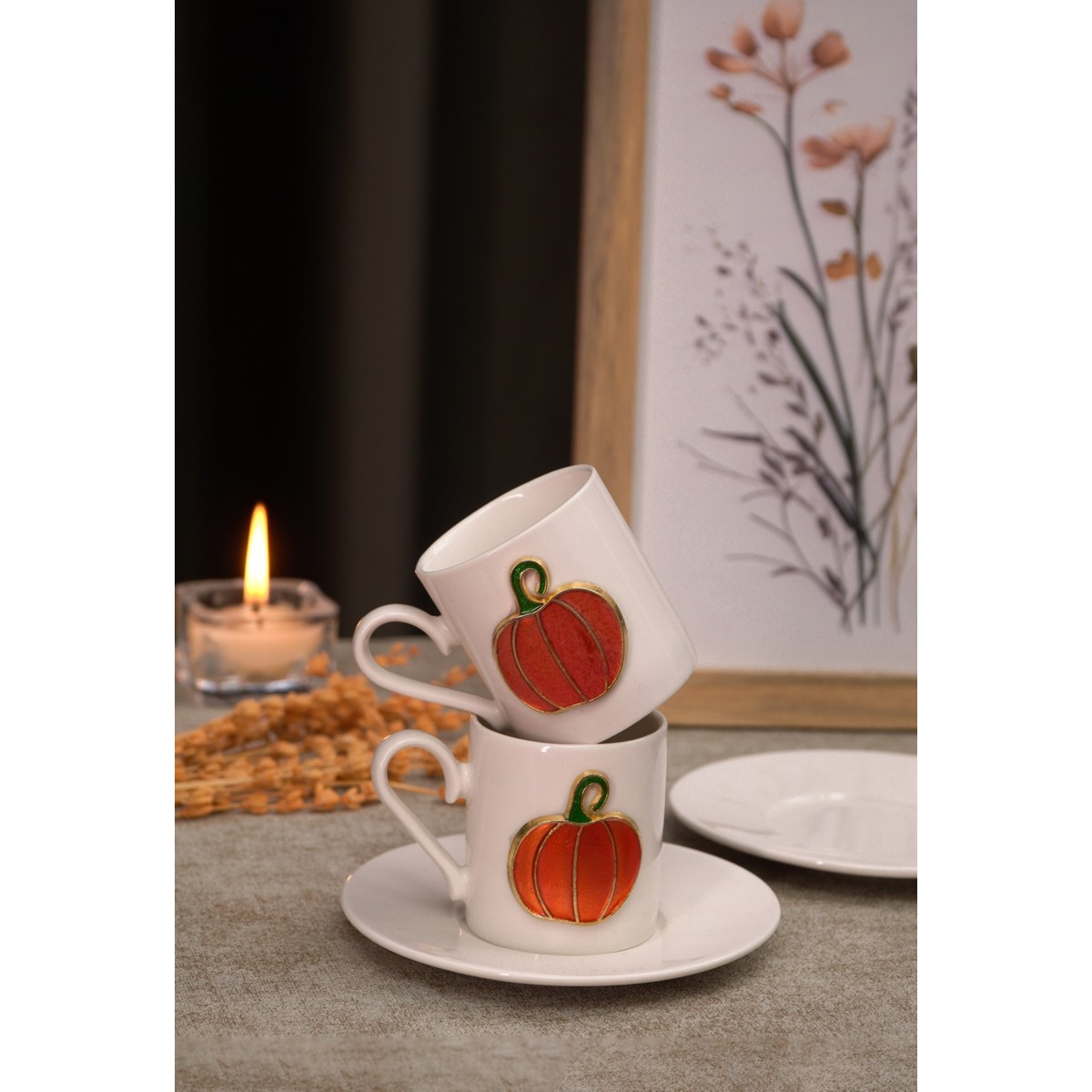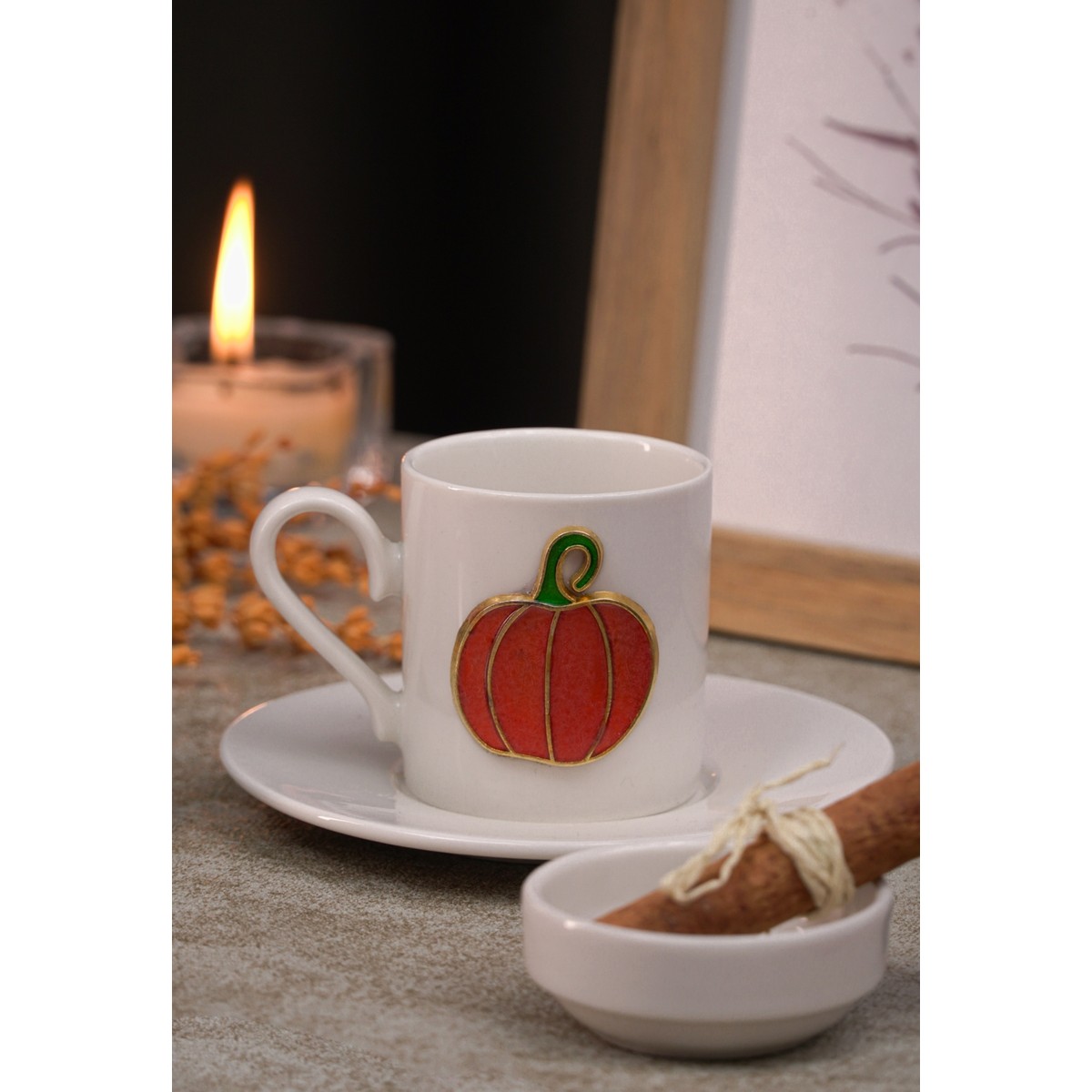 Bu zarif balkabağı işlemeli kahve fincan takımı, 100 ml kapasiteli fincanlar ve takım tabaklarından oluşan 4 parça 1 takım eşsiz üründür. Her bir fincan parçası ve tabağı, balkabağı süslemeleri ve göz alıcı detaylarıyla süslenmiştir, bu da sete lüks ve çekici bir görünüm kazandırır. İki kişilik bu set, kahve saatlerinizi zenginleştirecek ve her türlü özel anınızda zarif bir sunum sağlayacak. Kaliteli porselen malzemesi, uzun ömürlü kullanım sunarken, şık tasarımı sofralarınıza sofistike bir dokunuş ekler.
