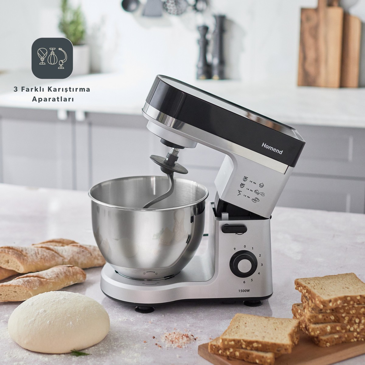 • 3 Farklı Karıştırma Aparatı (Çırpıcı, Karıştırma ve Yoğurucu)