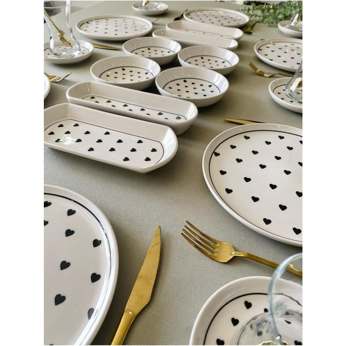Modern tasarımıyla dikkat çeken siyah kalp deseniyle sofralarınıza şıklık katıyor.; – 6 kişilik geniş kapasitesi ile aile yemeklerinizden özel davetlerinize kadar her türlü etkinlikte rahatlıkla kullanılabilir.; – Yüksek kaliteli seramik malzemesi sayesinde uzun ömürlü kullanım sunar ve kolay temizlenebilir özelliğiyle pratik bir bakım imkanı sağlar.; – Mikrodalgada güvenle kullanabileceğiniz bu set, hızlı ısıtma ihtiyaçlarınızda da yanınızda.; – Gıdaya temas edebilecek şekilde tasarlanmış olup, sağlıklı ve hijyenik bir kullanım vaat eder.; – Yuvarlak şekliyle klasik ve zamansız bir görünüm sergileyerek her türlü masa düzenine uyum sağlar.; – Toplamda 20 parçadan oluşan bu set, zengin çeşitliliğiyle günlük kullanım için idealdir.