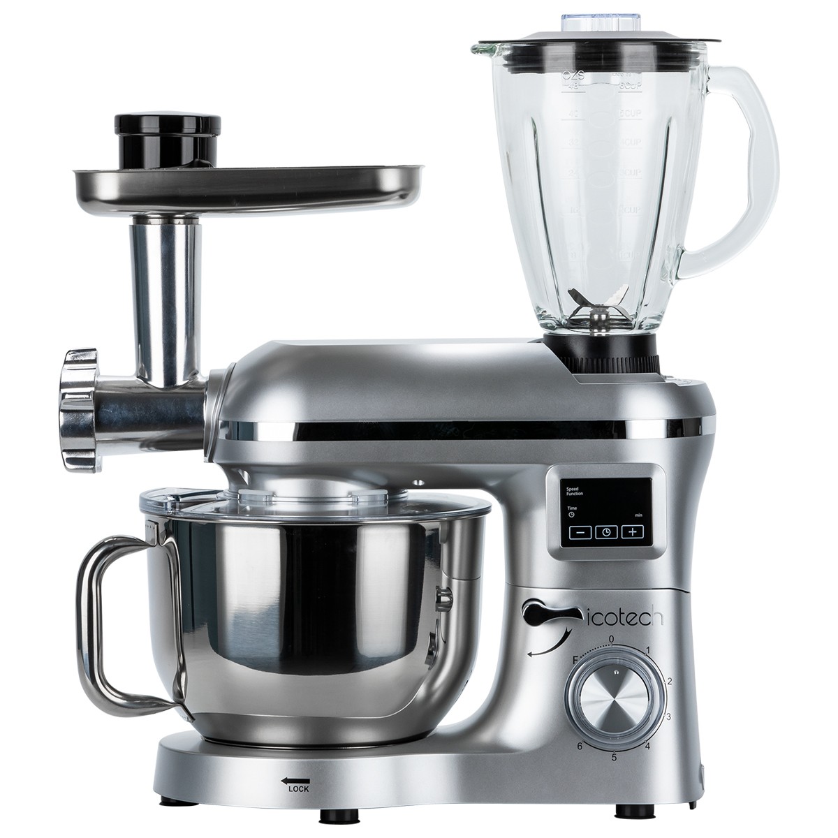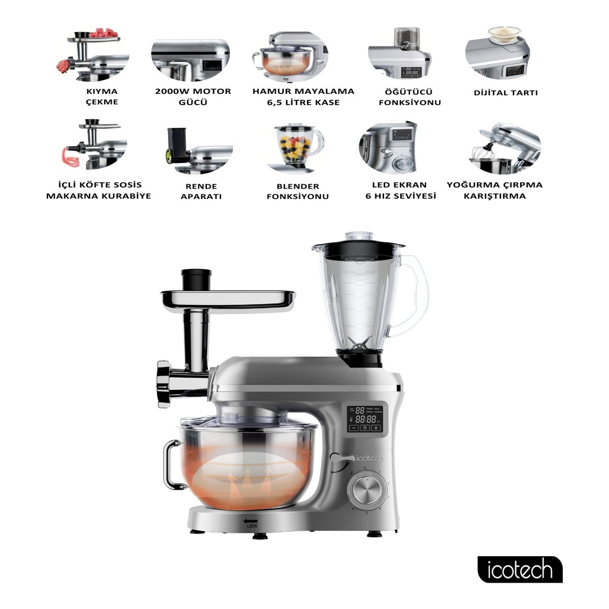 Icotech SM50 Gümüş LED Ekranlı Hamur Mayalama Kıyma Çekme Blender 2000W 6,5 Litre Stand Mikser Mutfak Şefi Hamur Yoğurma Makinesi