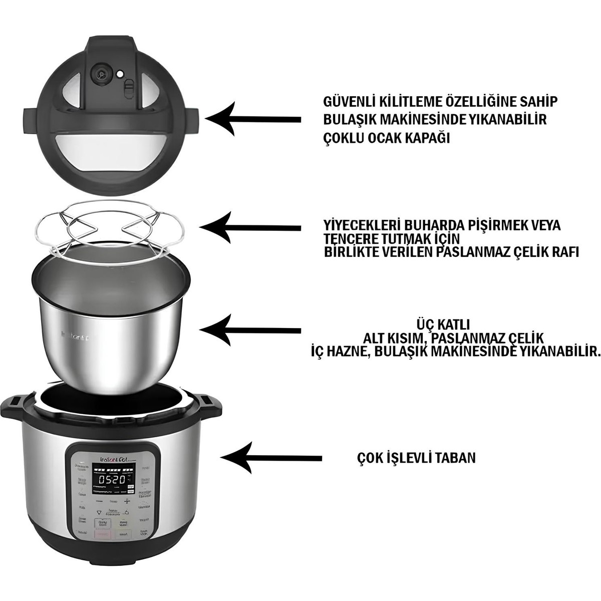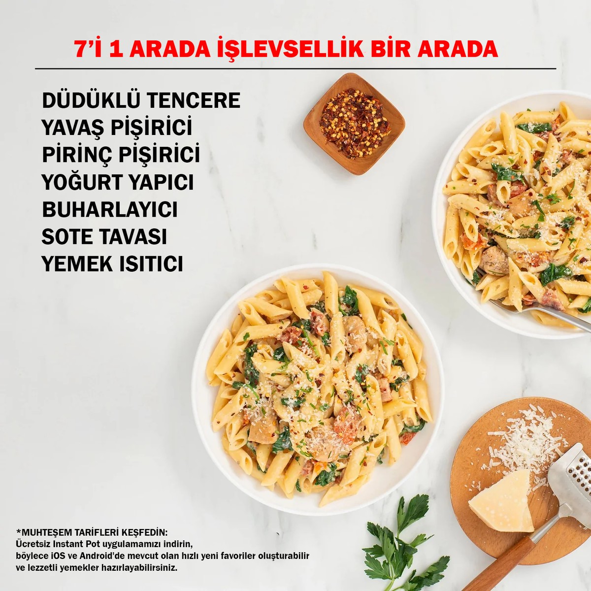 – 7’Sİ 1 ARADA İŞLEVSELLİK: Düdüklü tencere, yavaş pişirici, pirinç pişirici, yoğurt yapıcı, buharlayıcı, sote tavası ve yemek ısıtıcısı.
