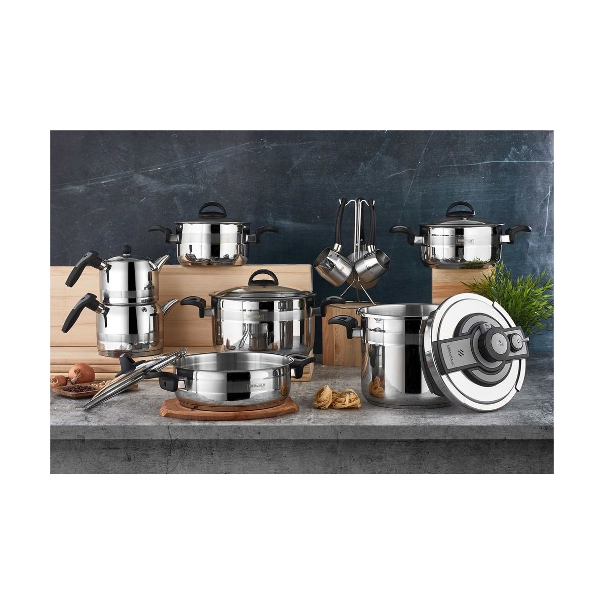 Set İçeriği: 18×10 Cm Derin Tencere 2 Prç 20×10 Cm Derin Tencere 2 Prç 24×14 Cm Derin Tencere 2 Prç 24×8 Cm Basık Tencere 2 Prç 7 lt Düdüklü Tencere 2 Prç Orta Boy Çaydanlık Takımı 4 Prç 3’lü Cezve Seti 4 Prç *18/10 Paslanmaz çelikten üretilmiştir. *Kapsül tabanı sayesinde ısıyı muhafa eder,zamandan ve yakıttan tasarruf sağlar. *Bulaşık makinasında kullanıma uygundur. *İndiksiyon ocaklarda kullanıma uygundur. *Susuz olarak ocakta bırakmayınız. *Bulaşık makinası veya elde yıkama yapıldıktan sonra ürünün kurutulması ömrünü uzatır ve parlak kalmasını sağlar.