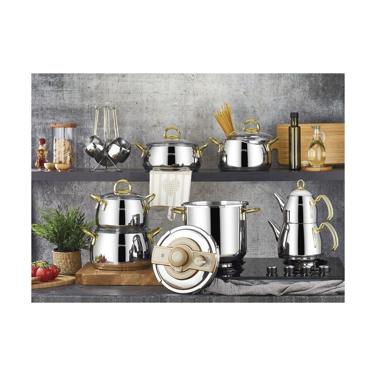 Kahramanlar Çelik Çeyiz Seti 18 Parça Gold Kulplu Tencere Takımı