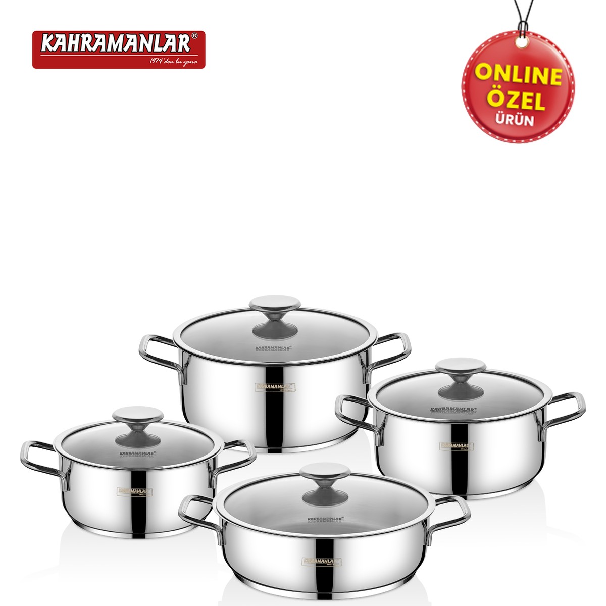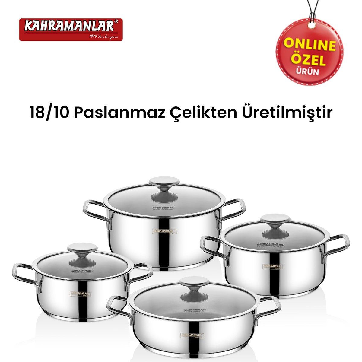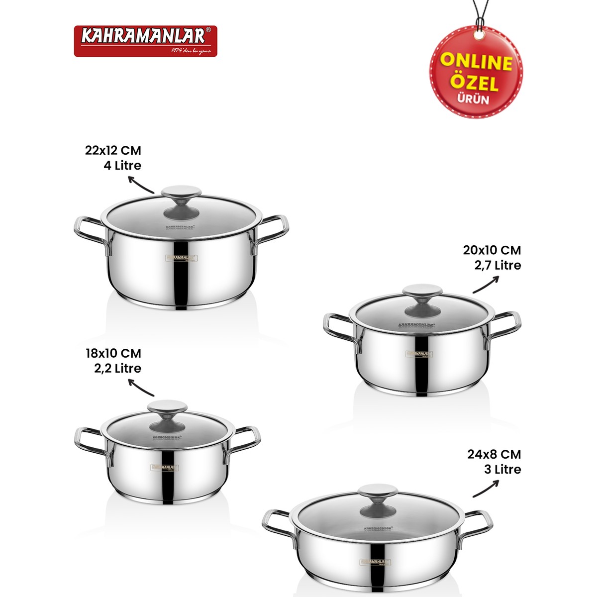 Set İçeriği: 18 CM – 20 CM – 22 CM Derin Tencere 24 CM Basık Tencere ve Kapaklarıdır Toplamda 8 Parçadır.