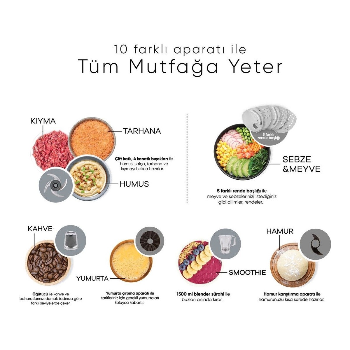 • 10 farklı aparatı ile doğrama, karıştırma, öğütme, rendeleme, dilimleme, yoğurma ve çırpma fonksiyonlarının hepsini bir arada sunar.