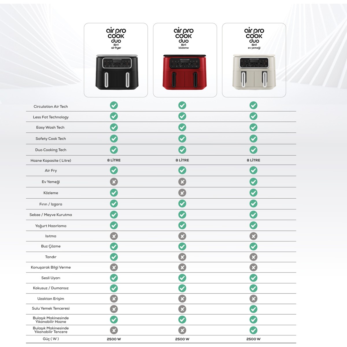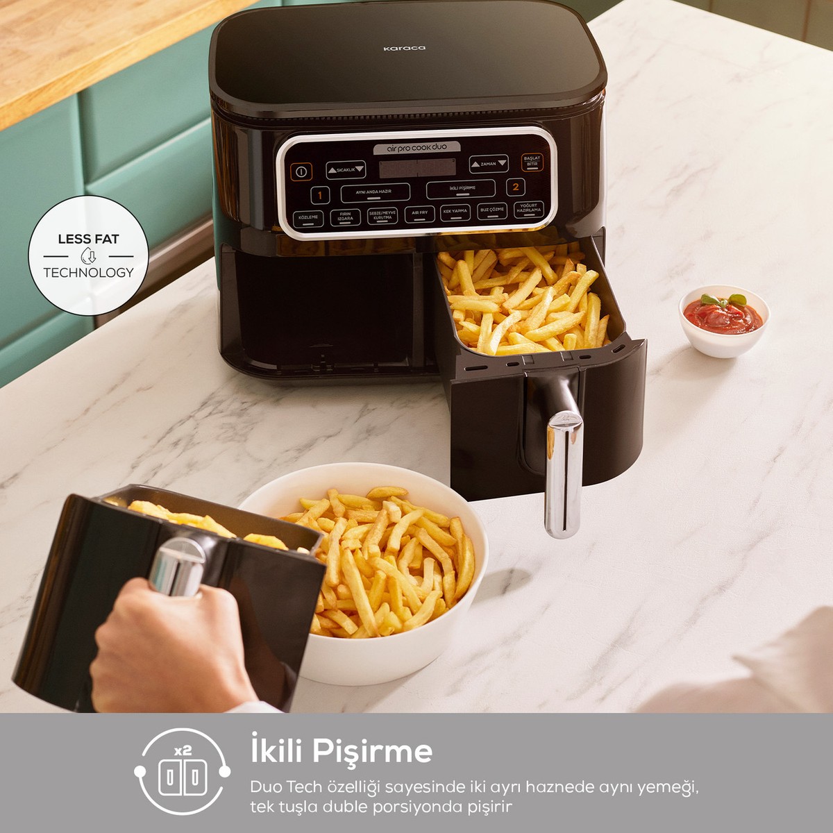Karaca Air Pro Cook Duo; tüm lezzetleri Less Fat Technology ile sadece birer kaşık yağ kullanarak hazırlar. Circulation Air Tech ile yukarıdan aşağıya hareket eden sıcak hava akımıyla yemeklerinizin her noktası eşit pişer. Duo Tech özelliği sayesinde 3 farklı pişirme modunda dilediğiniz gibi yemeğinizi hazırlayabilirsiniz. İster Aynı Anda Hazır fonksiyonuyla iki farklı haznede, farklı sürelerde pişen yemekleri aynı anda hazır olacak şekilde servis edebilir, ister İkili Pişirme fonksiyonuyla XXXL  4+4 litre iki geniş haznede aynı yemeği, tek tuşla duble porsiyon yapabilirsiniz. İsterseniz tarifinize göre sıcaklık ve dakika ayarını manuel olarak da ayarlayabilirsiniz.
