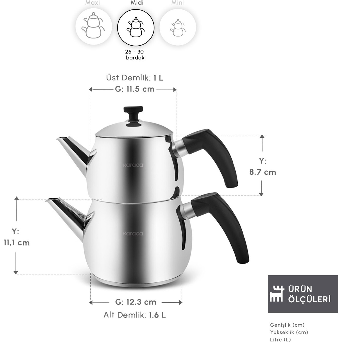 Karaca Alim İndüksiyon Tabanlı Midi Boy Çaydanlık TakımıKaraca Alim İndüksiyon Tabanlı Midi Boy Çaydanlık Takımı 1 litre demlik ve 1,6 litre su haznesi ile çayınızı tam tadında demler.Işıltısı ve şık kulpları ile mutfağınıza yakışır.Üstelik paslanmaz çelik yapısı sayesinde sağlıklı ve uzun ömürlü bir kullanım sunar.Malzeme: Paslanmaz Çelik