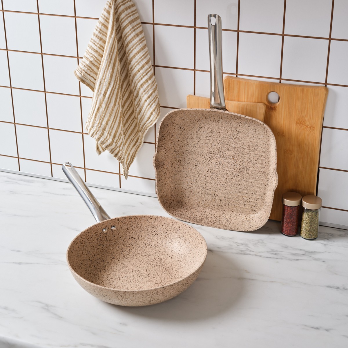 Nare Wok Grill Tava Set, ısıyı her tarafa eşit dağıtarak yemeklerin lezzetini arttırır. Maksimum yanmaz yapışmazlık sağlayan granit görünümlü kaplaması, leke tutmz özelliğiyle de kolayca temizlenmesine yardımcı olur.