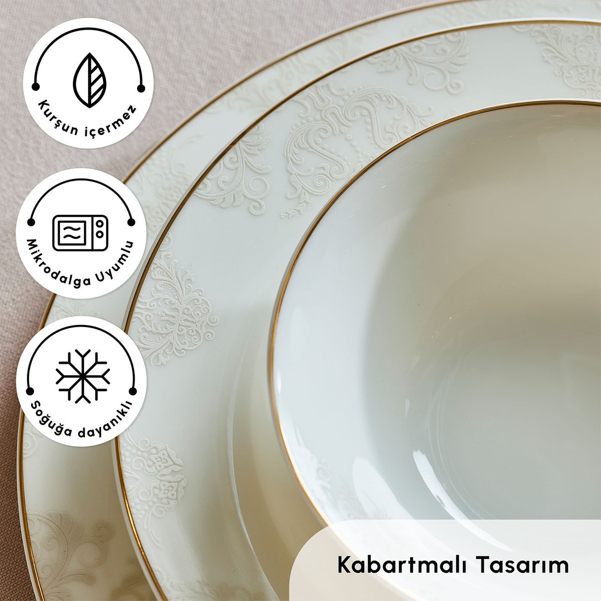 Bone Collection, yuvarlak formuyla sofralarda klasik şıklığı simgeliyor… Şeffaf, sade tasarımlarıyla zarif görünümlüdür ve masanızın dekorasyonundaki renkleri öne çıkarır. Çarpıcı şıklığının yanında son derece hafiftir. Hafifliğine eşlik eden kalitesiyle sofralarınıza uzun yıllar konuk olur. Bone Collection’ı ister özel günlerde ister günlük kullanımda rahatlıkla tercih edebilirsiniz. Karaca Siena New Bone 53 Parça 12 Kişilik Yemek Takımı Gold ;Malzeme:New Bone ;12 Adet Servis Tabak 26 cm;12 Adet Çukur Tabak 21,5 cm;12 Adet Pasta Tabak 19 cm;12 Adet Kase 14 cm;2 Adet Küçük Kayık Tabak 20 cm;1 Adet Tuzluk;1 Adet Biberlik;1 Adet Kürdanlık