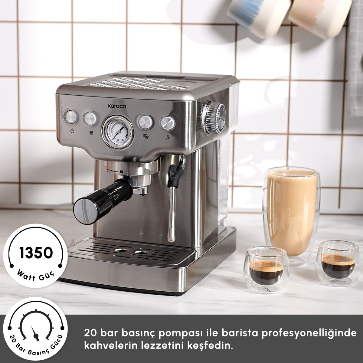 Karaca Coffee Art 1353 Espresso Makinesi ile tercihinize göre espresso, latte, cappuccino, americano, flat white, cortado, macchiato, lungo, affogato, ice latte, ice cappuccino ve ice americano gibi kahveleri tam kıvamında hazırlamak artık çok kolay. Karaca Coffee Art 1353 Kahve Makinesi’nin, hacimsel kontrolü sayesinde espressonuzu tek veya çift doz olarak tercih edebilirsiniz. Buhar çubuğu ile, cappuccino, latte ve flat white gibi kahveler için kıvamlı süt köpükleri hazırlayabilir; süt, sıcak çikolata gibi içecekleri ısıtabilirsiniz. Coffee Art 1353 Kahve Makinesi’nin 1800 ml’lik geniş su haznesi ile uzun süre zahmetsizce kahvelerinizi hazırlayabilirsiniz. Fincan ısıtma plakası ile kahve fincanlarınız için ön ısıtma yapabilir, kahvenizin daha uzun süre sıcak kalmasını sağlayabilirsiniz. Termoblok ısıtma sistemi ile buhar moduna hızlıca geçiş yapabilir, içeceklerinizi beklemeden en iyi şekilde hazırlayabilirsiniz. Otomatik kapanma, aşırı ısınma ve basınç koruması sayesinde oldukça güvenlidir. Kolay temizlenir.