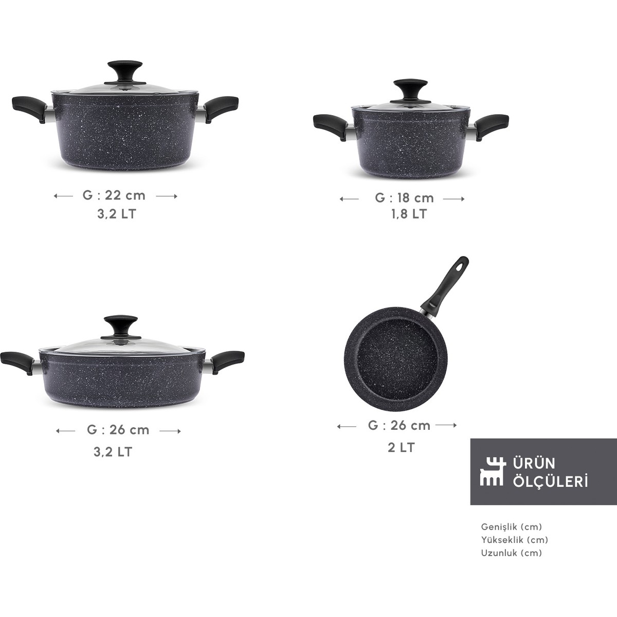 Tencerelerin ölçüsüne çok dikkat etmemiştim, geniş ve sığ olan tenceresi ile tavası gayet iyi ölçülerde. Derin tencerelerden büyük olanı beklediğimden çok küçük geldi. Ama yine de gayet iyi.