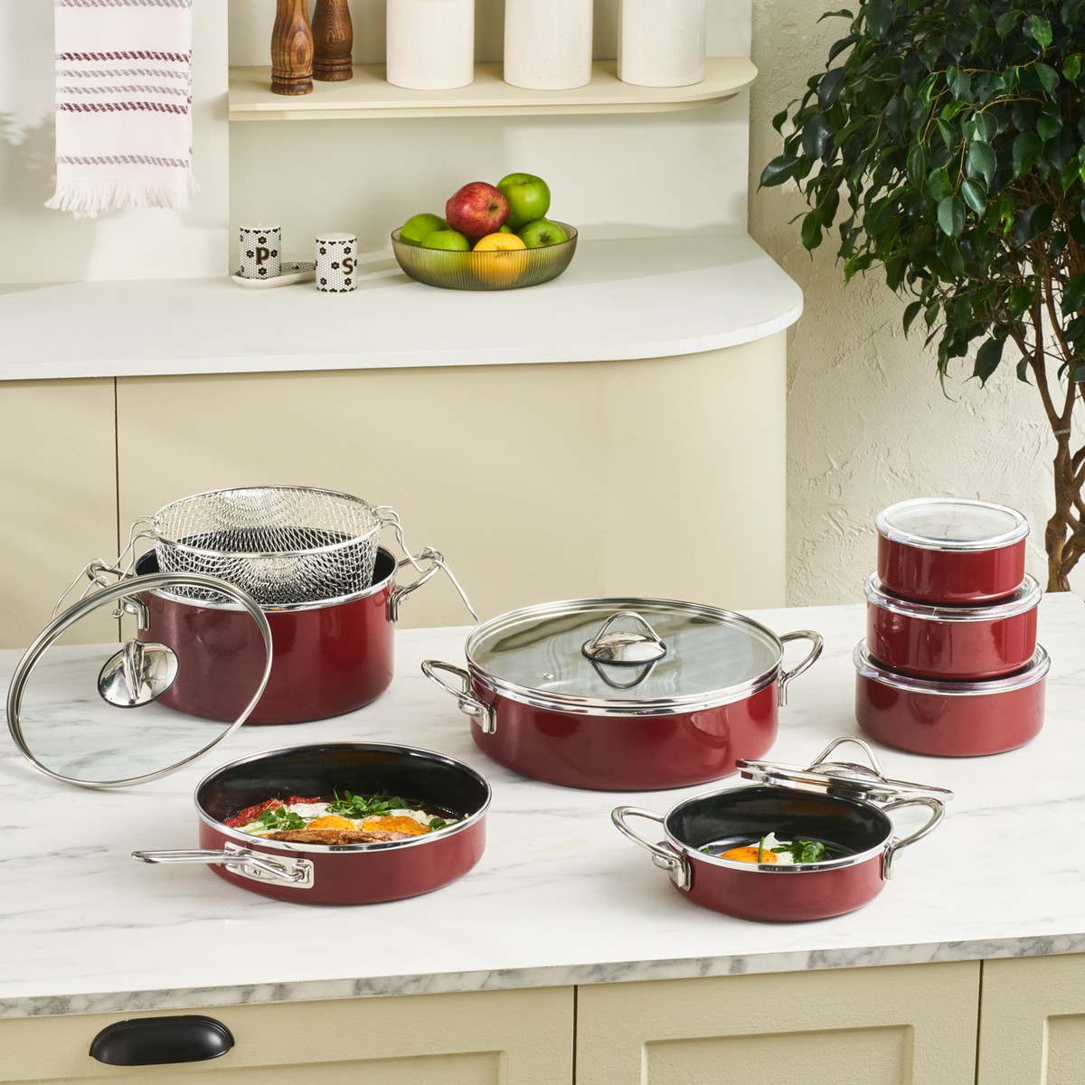 Karaca Erva Emaye İndüksiyon Tabanlı 14 Parça Çeyiz Seti Bordo