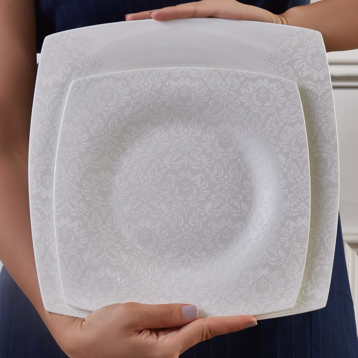 Karaca Fine Pearl Helen 62 Parça 12 Kişilik Beyaz Porselen Kare Tabaklı Şık Yemek Takımı