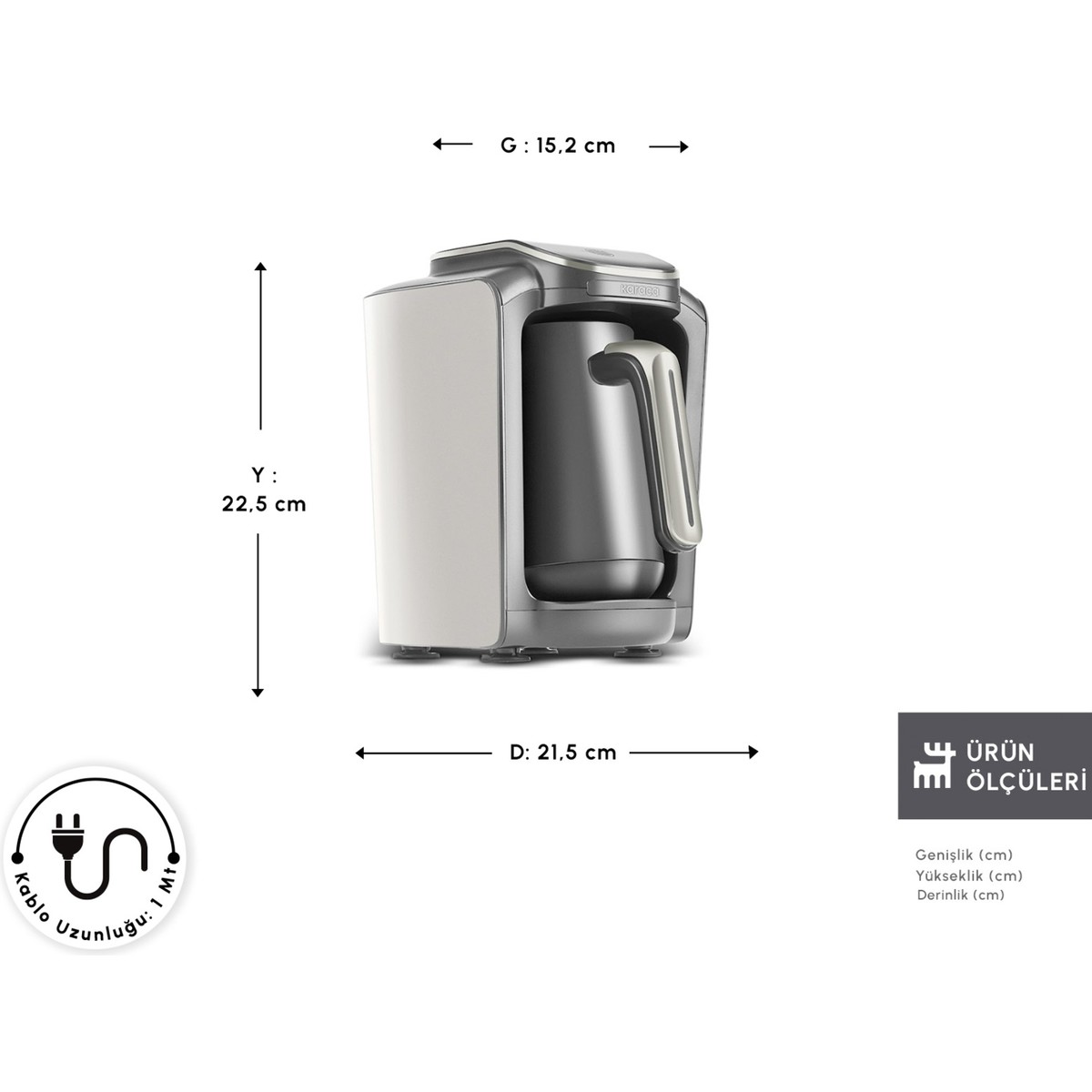 Karaca Hatır Neo Türk Kahvesi Makinesi ile Türk kahvesi, közde Türk kahvesi ve aromalı Türk kahvesi keyfi sizinle! Damak zevkinize göre istediğiniz 3 lezzetten birini seçerek tek seferde 5 fincan kahve hazırlayabilirsiniz. Sıcaklığını otomatik ayarlayarak kahvenizi en lezzetli şekilde pişirir. Sesli ve ışıklı uyarı sistemi, pişirme tamamlandığında size haber verir; böylece makinenin başında beklemenize gerek kalmaz. Sahip olduğu taşma önleyici sensör ve otomatik kapanma fonksiyonuyla güvenli bir kullanım sunar.
