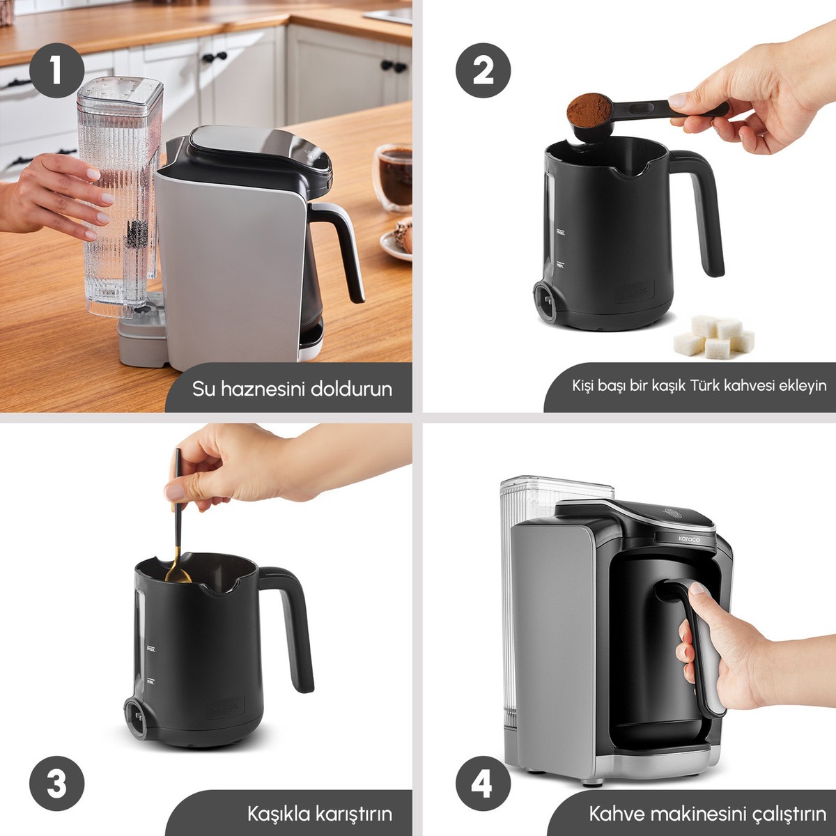 Karaca Hatır Su Türk kahve makinesidir. Süt tozu, süt, neskafe vb. kahve malzemelerinin kullanımı için uygun değildir.